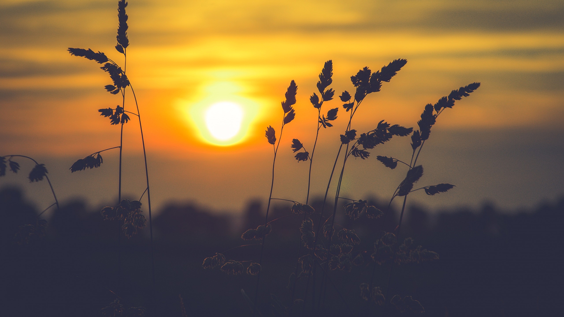 Description: A sunset with a few tall grass in the foreground and a building in the background with a few clouds.