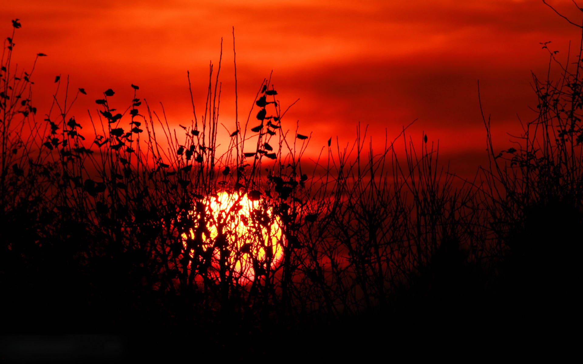 Description: A sunset with the sun setting behind some tall grass and plants in the foreground.