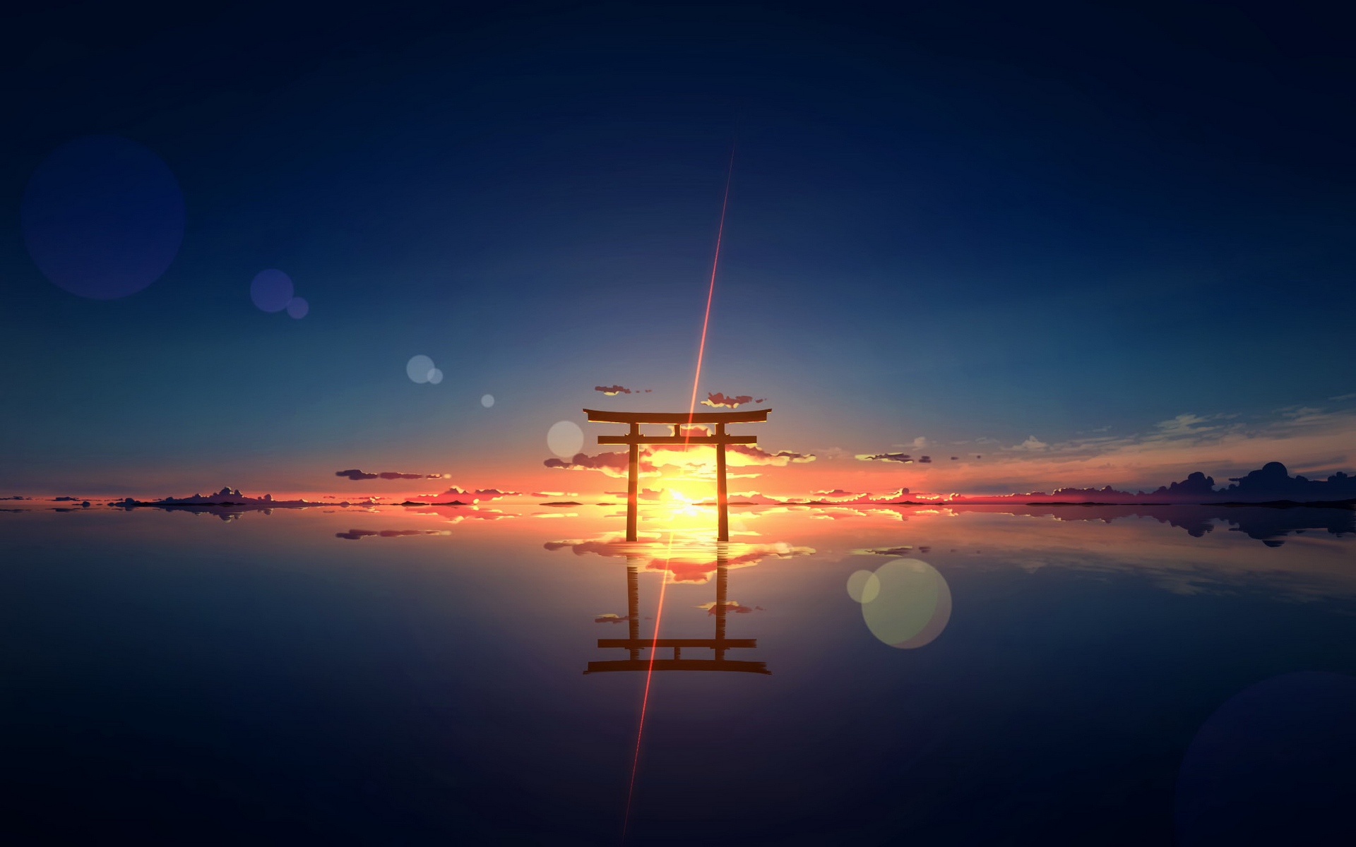 Description: A sunset with a small tower in the middle of the water and a sky background with clouds and sun.