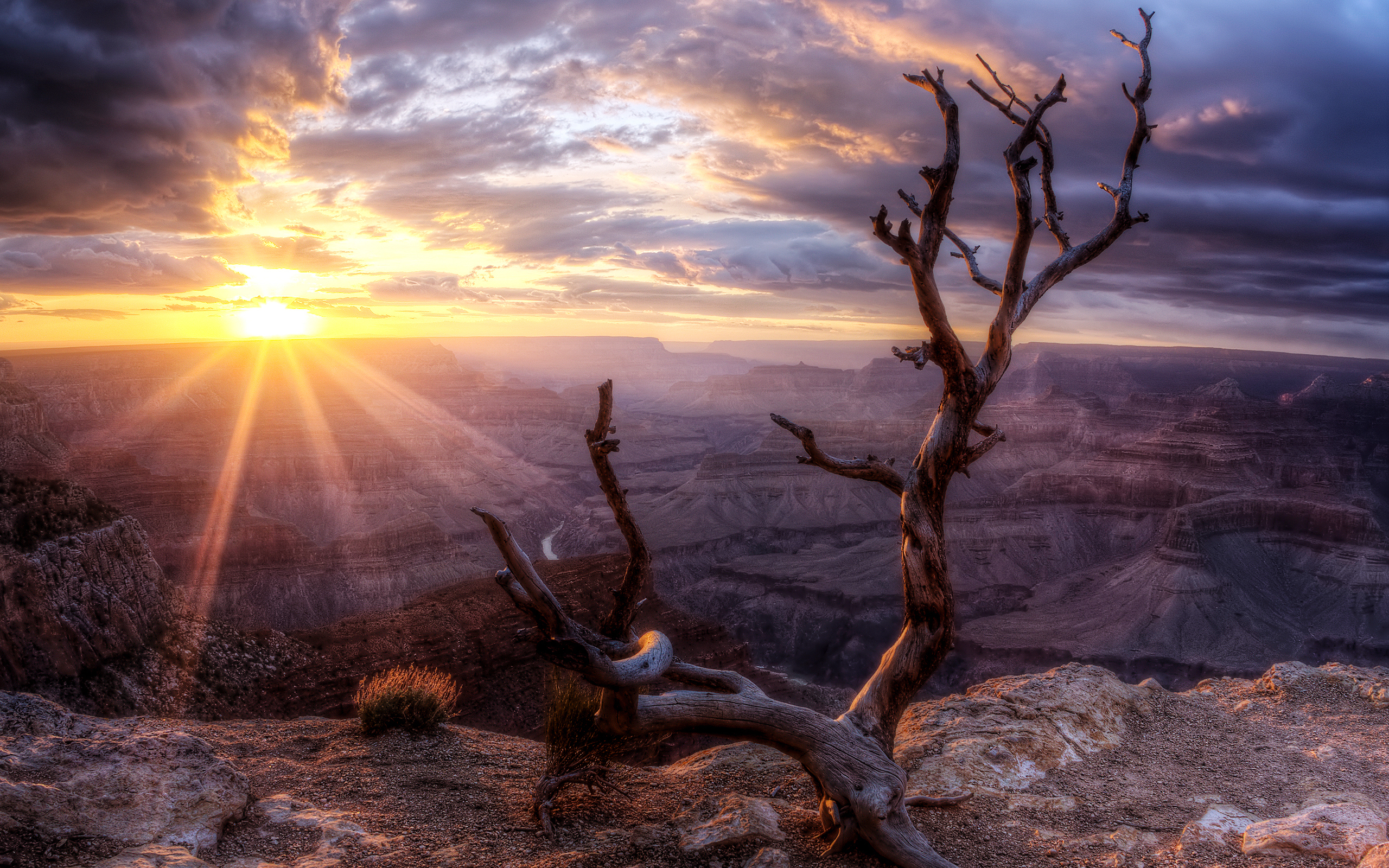 Description: A tree branch with the sun setting in the background and clouds in the sky above it.