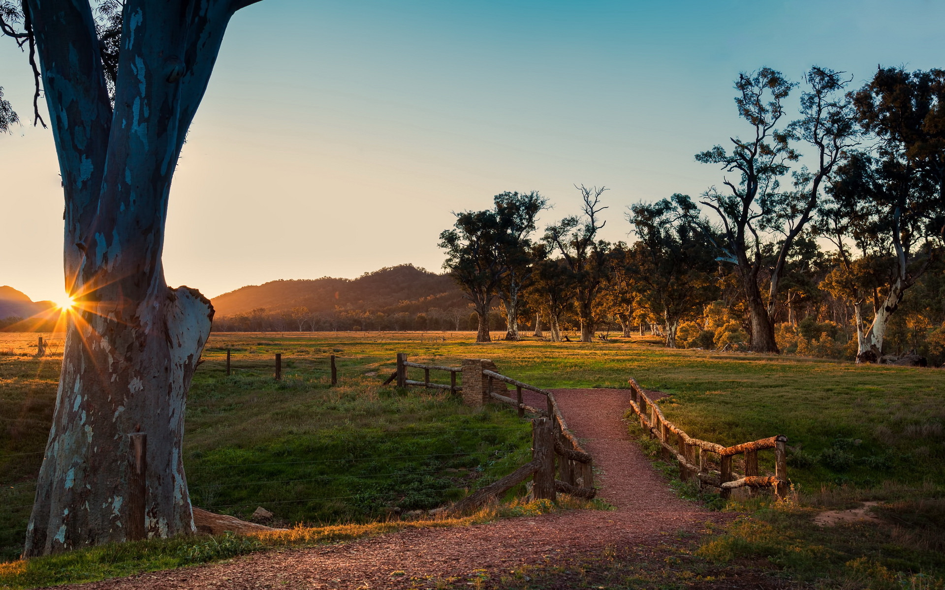 Description: A path leading to a tree in a field at sunset with the sun setting behind it and a fence in the foreground.