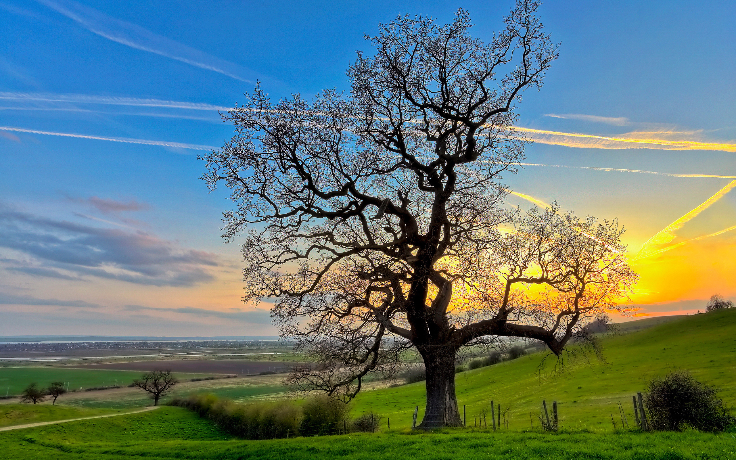 Description: A tree in a field with a sunset in the background and contrails in the sky above it.