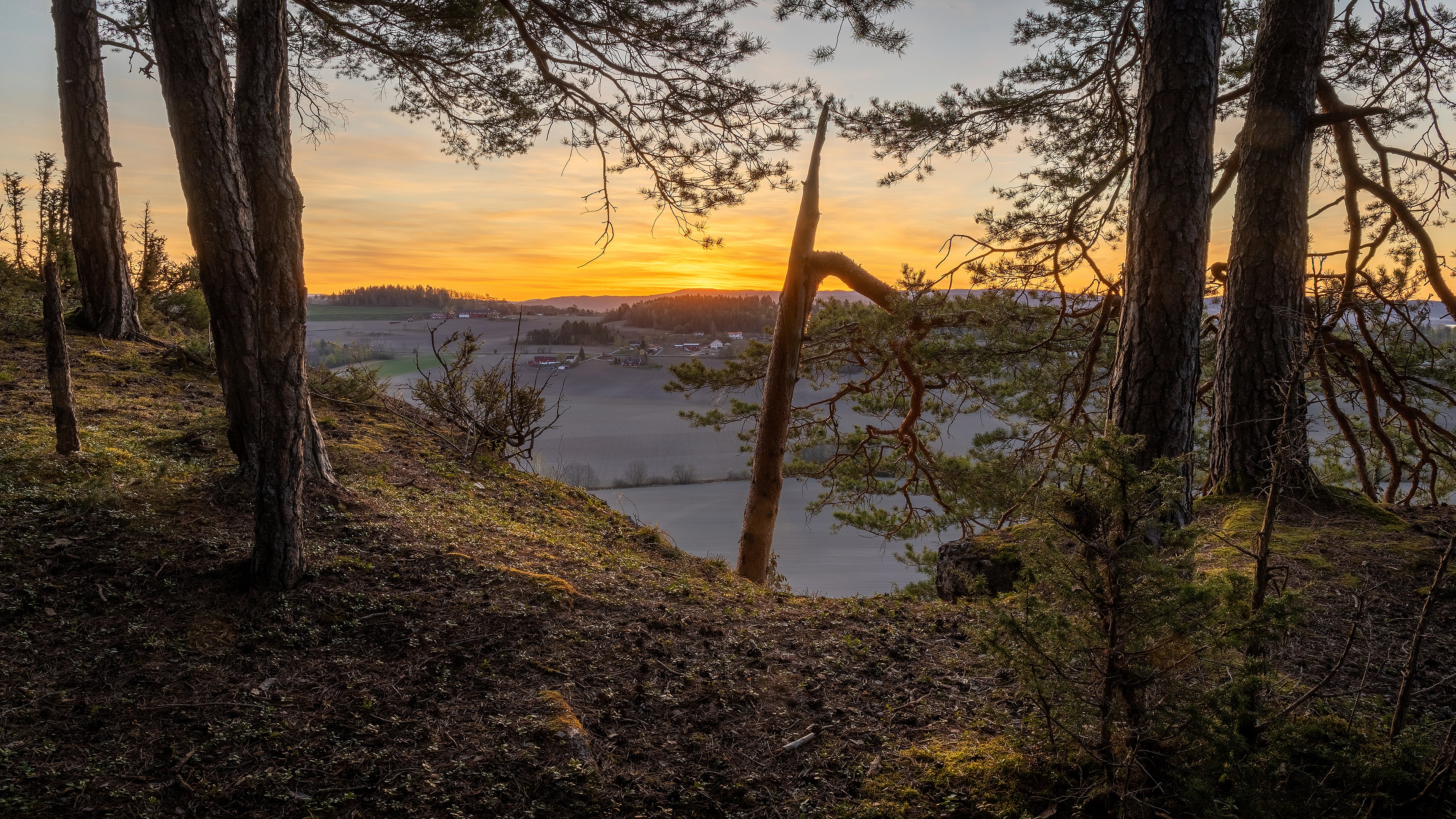 Description: A sunset in the distance with trees and a body of water in the foreground and a hill in the background.