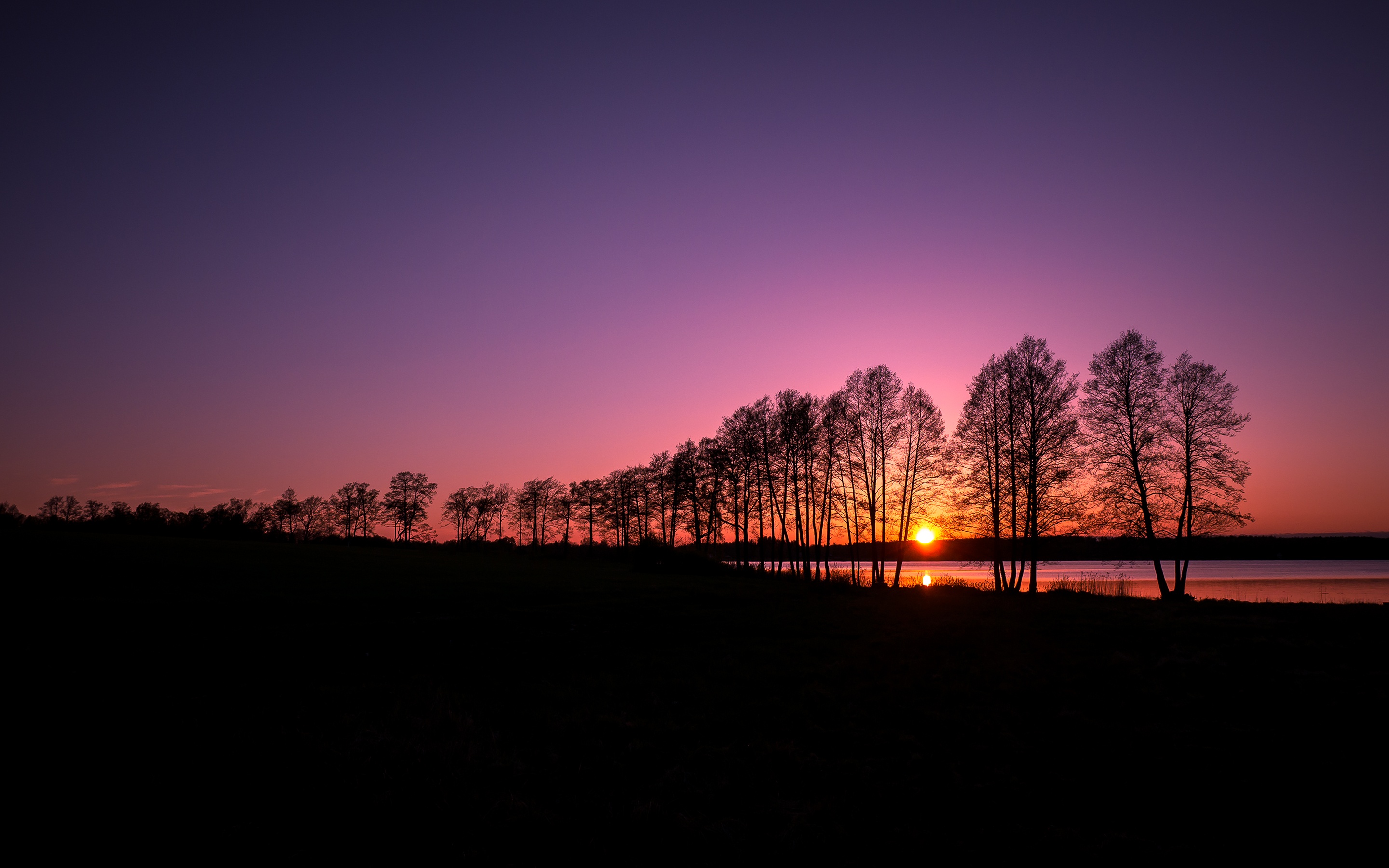 Description: A sunset with trees and water in the background and a purple sky with a few clouds in the distance.