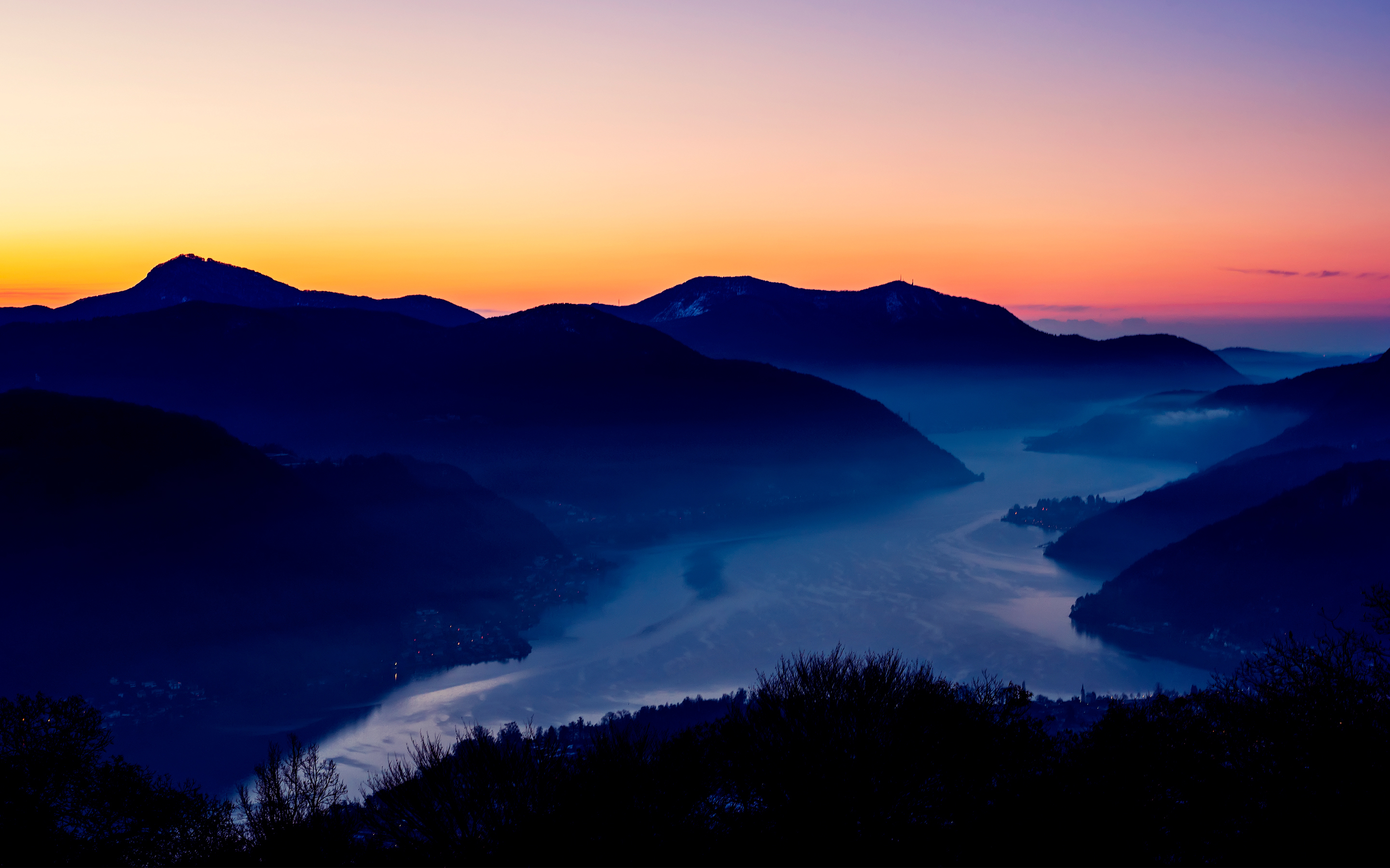 Description: A sunset view of a valley with mountains in the background and a river running through the valley below it.