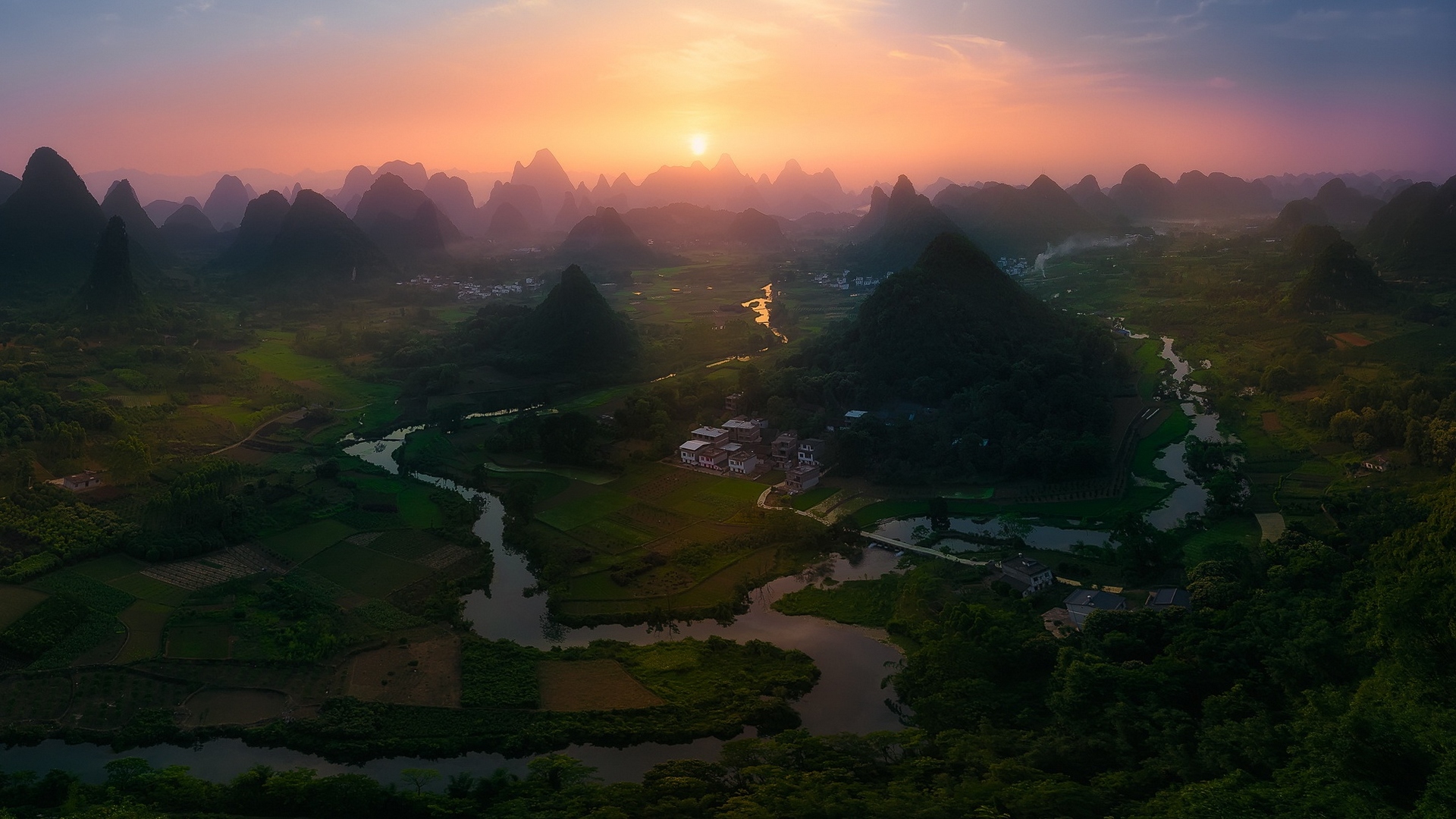 Description: A beautiful sunset over a valley with mountains in the background and a river running through it.