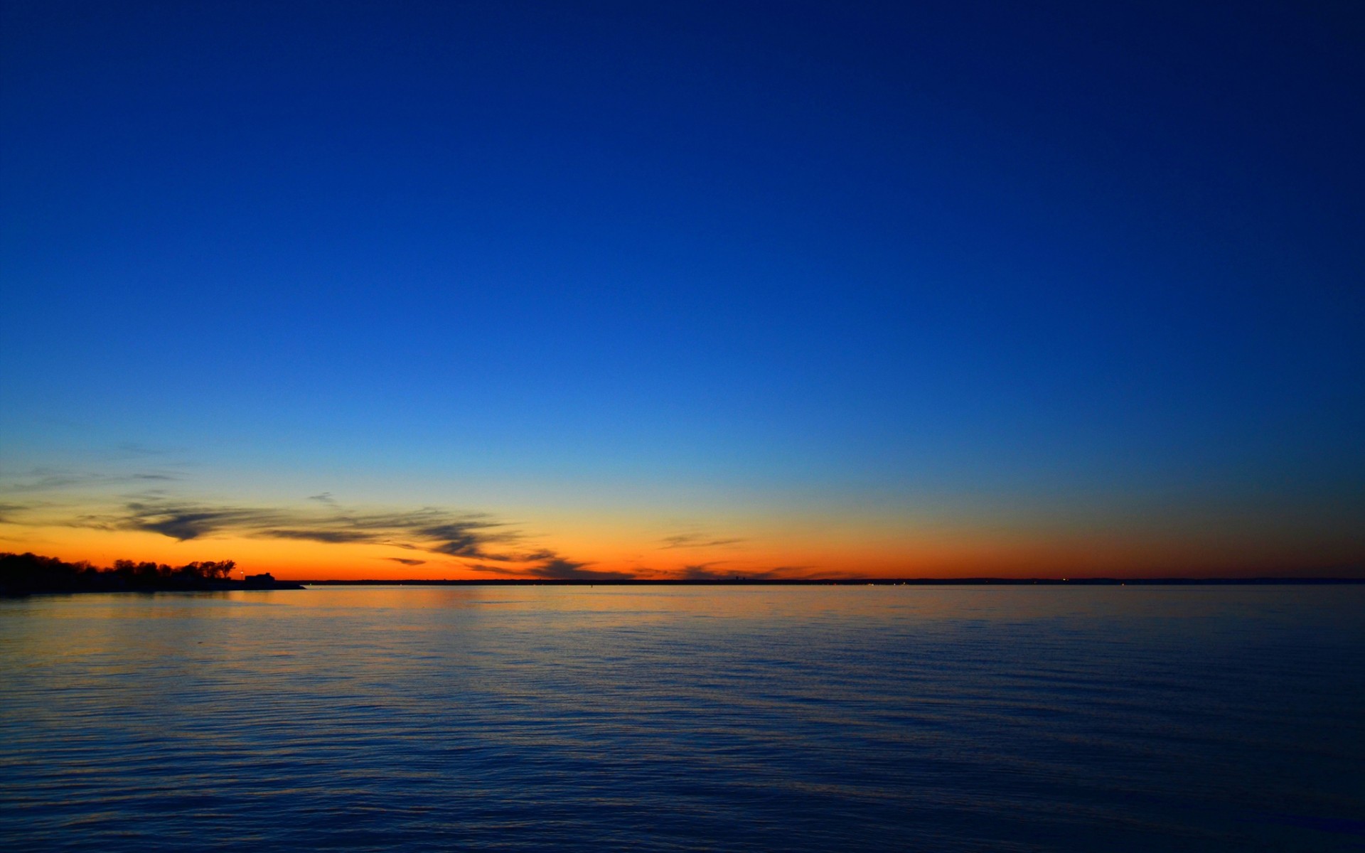 Description: A sunset over a body of water with a boat in the distance and a few clouds in the sky.