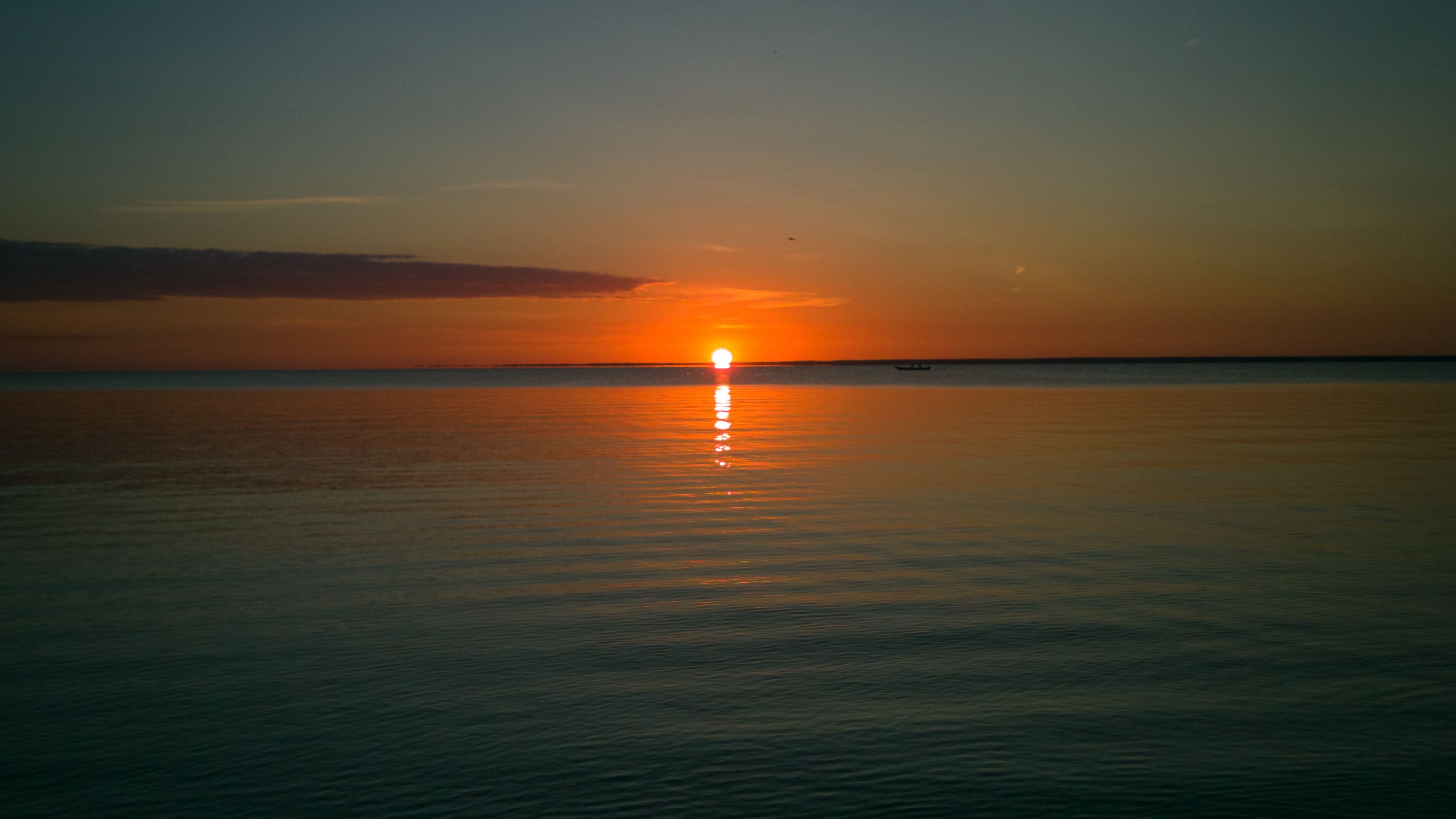 Description: A sunset over a body of water with a boat in the distance and a few clouds in the sky.
