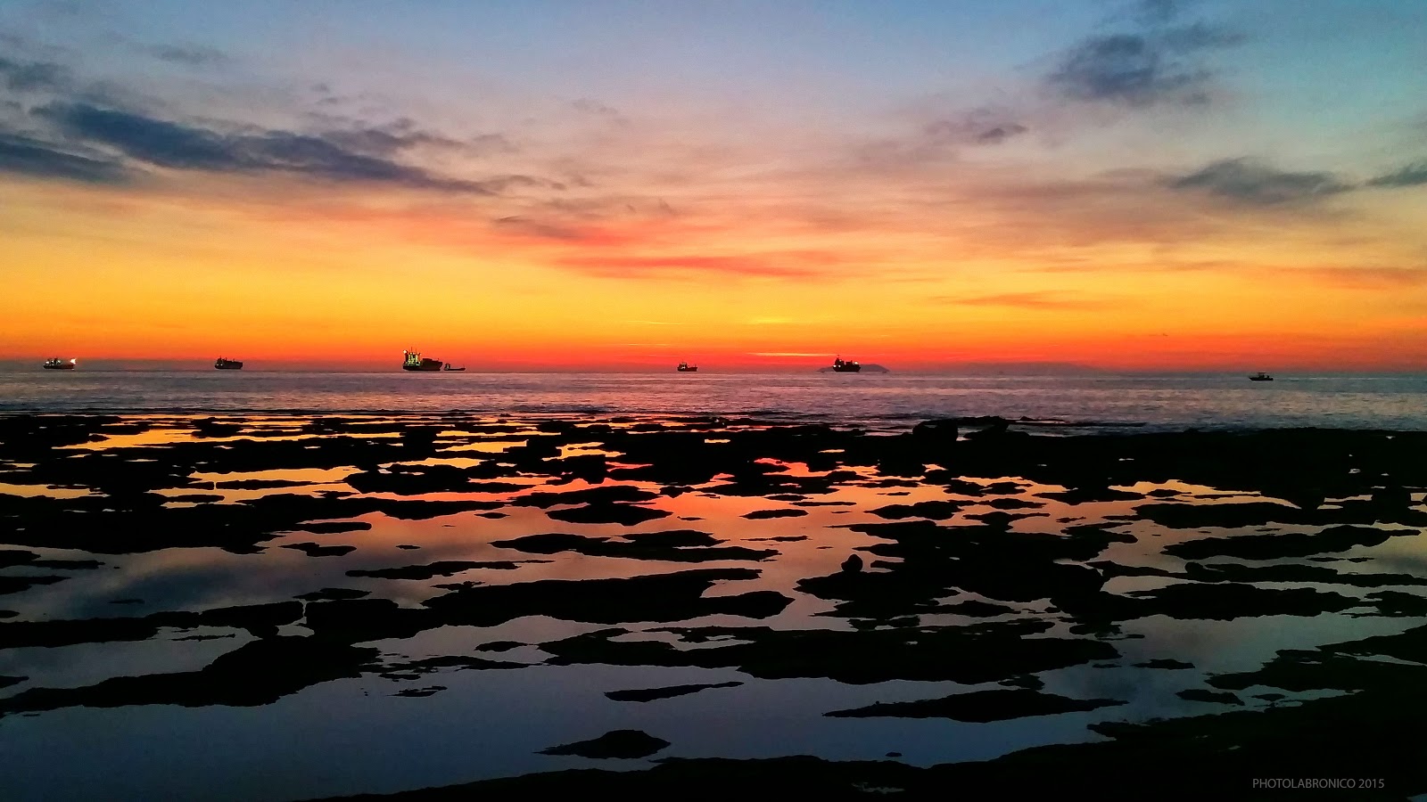 Description: A sunset over a body of water with boats in the distance and a sky filled with clouds above it.
