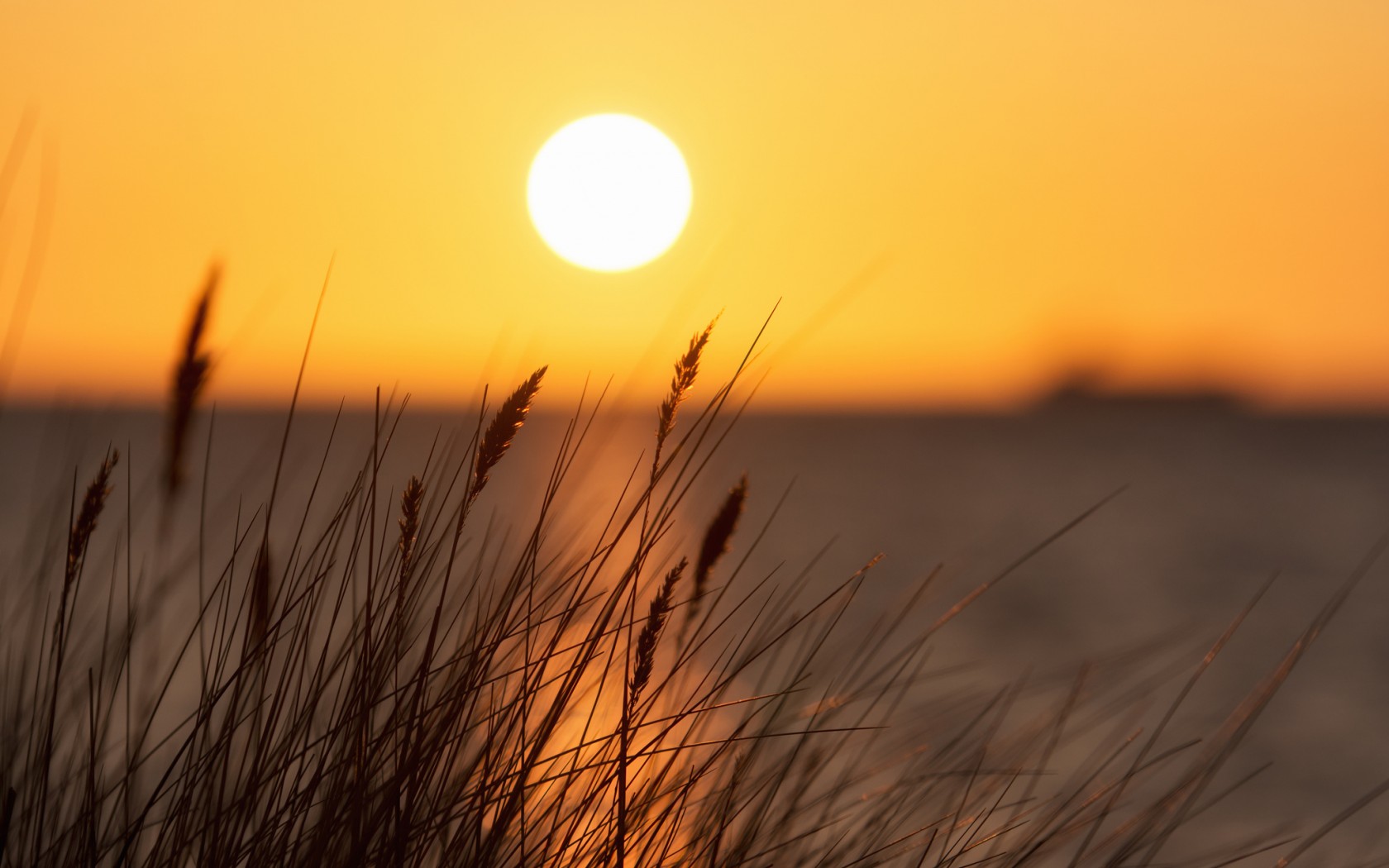 Description: A sunset over a body of water with grass in the foreground and a building in the background with a yellow sky.
