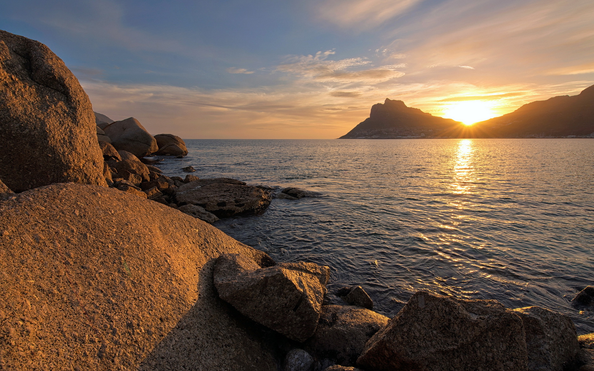 Description: A sunset over a body of water with rocks in the foreground and mountains in the background.