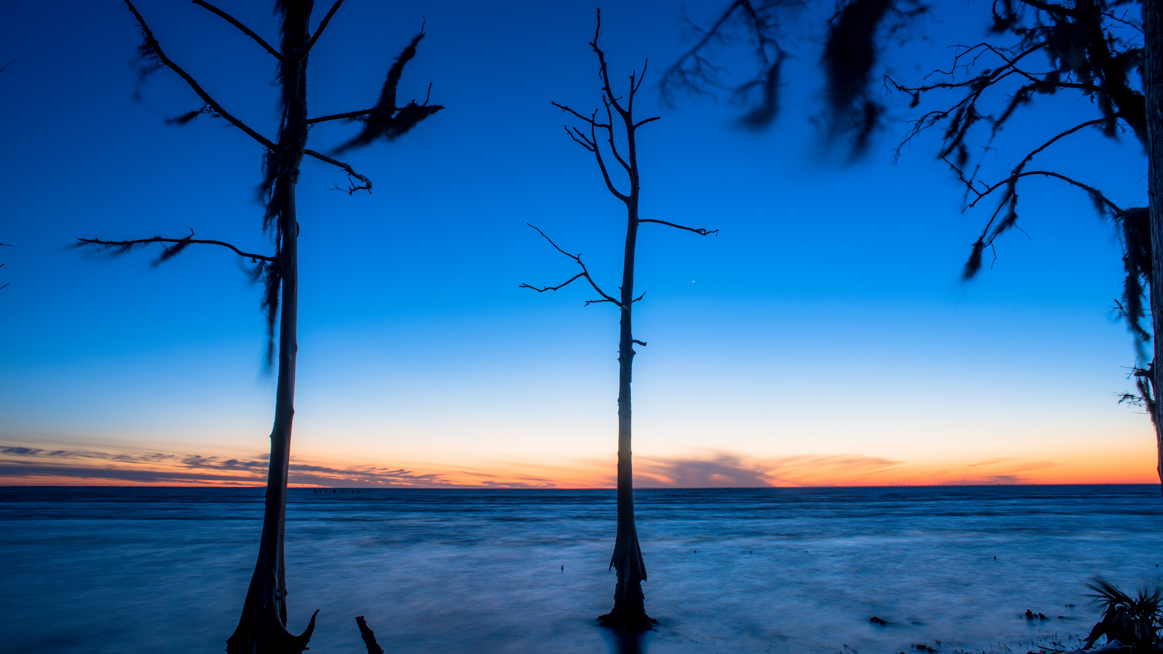 Description: A sunset view of a body of water with trees in the foreground and a few clouds in the distance.