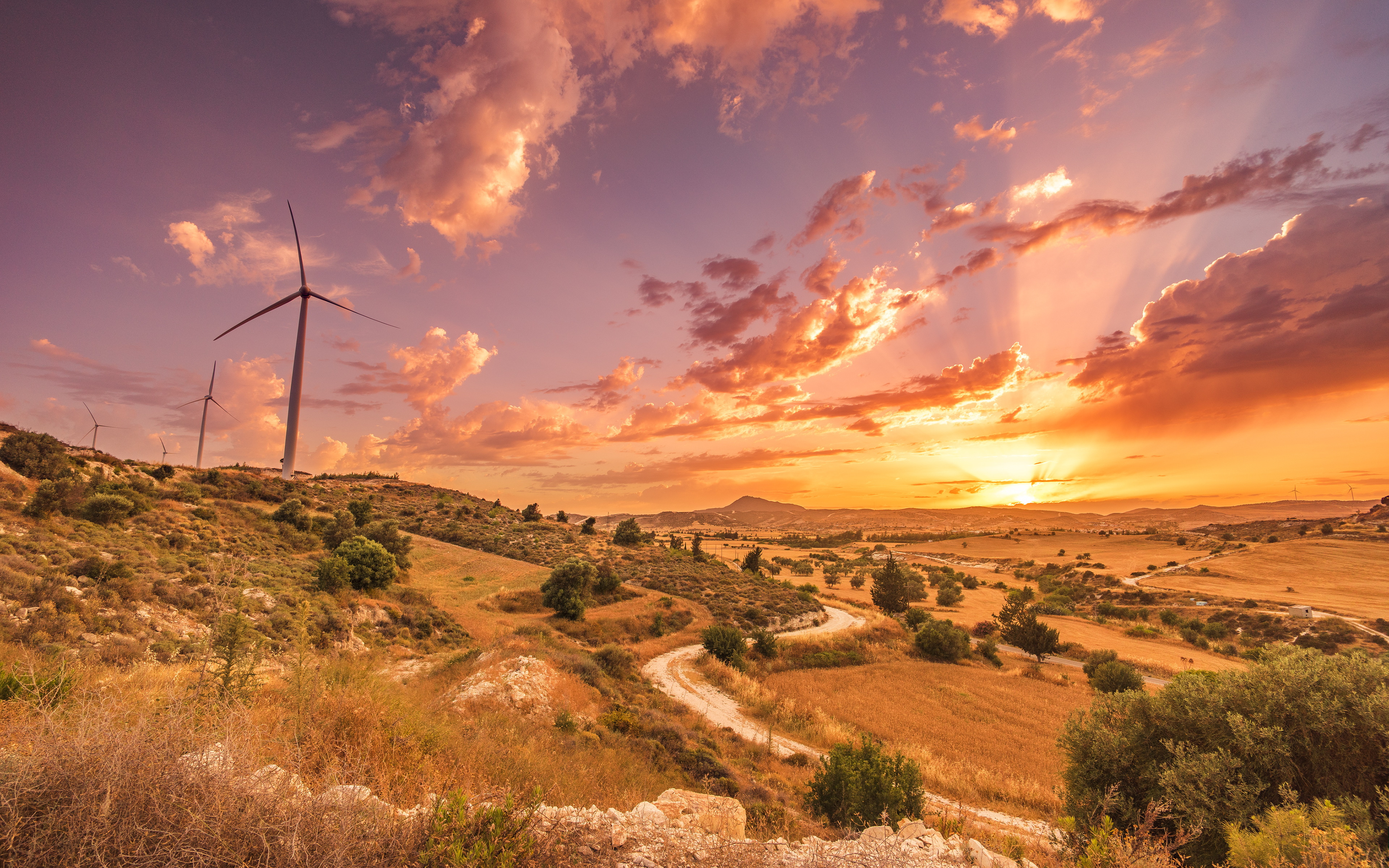 Description: A sunset view of a wind farm with a windmill in the distance and a dirt road winding through the field.