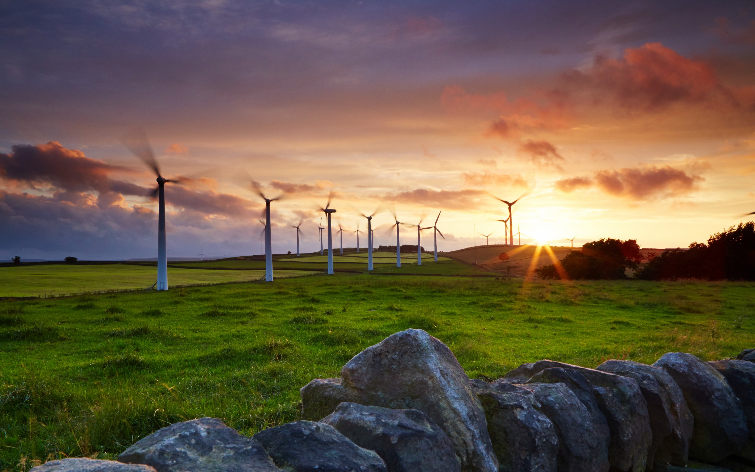 Description: A field with a bunch of wind mills in the distance at sunset with a few clouds in the sky.