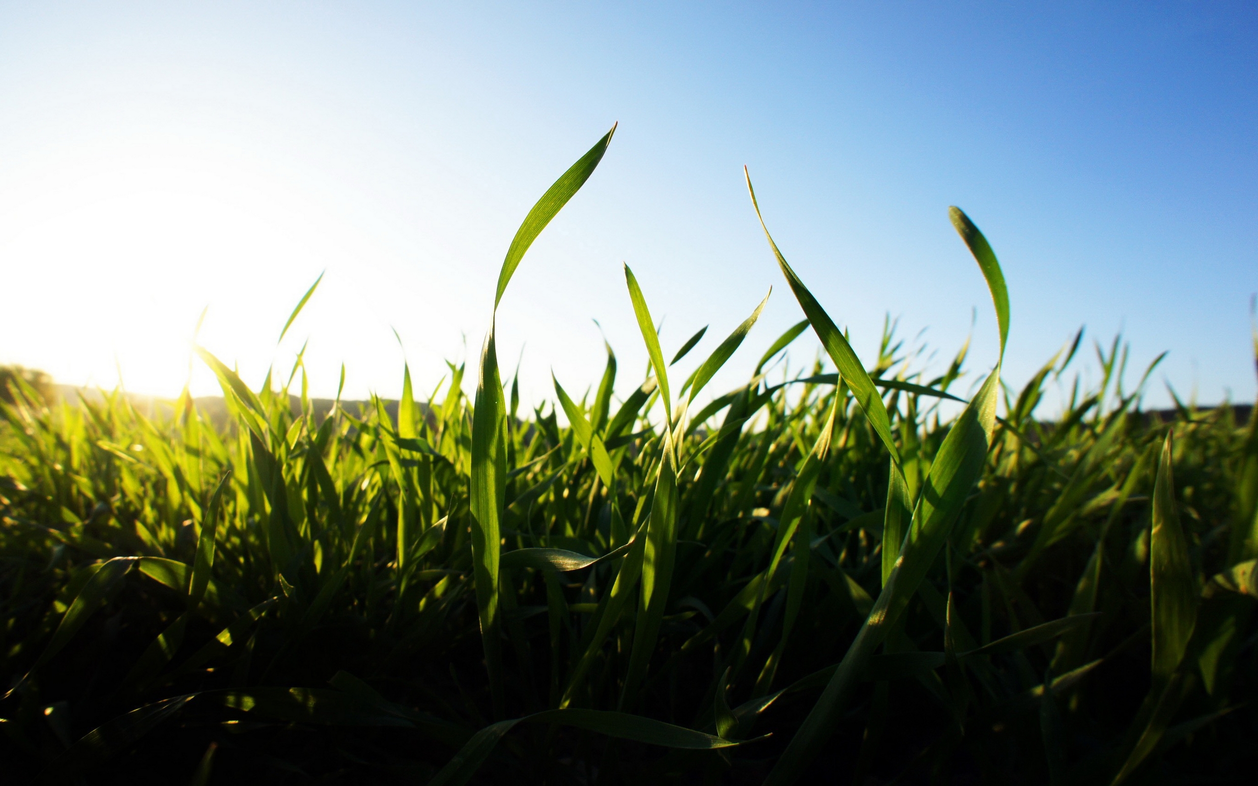 Description: A field of grass with the sun shining in the background and a blue sky in the background with a few clouds.