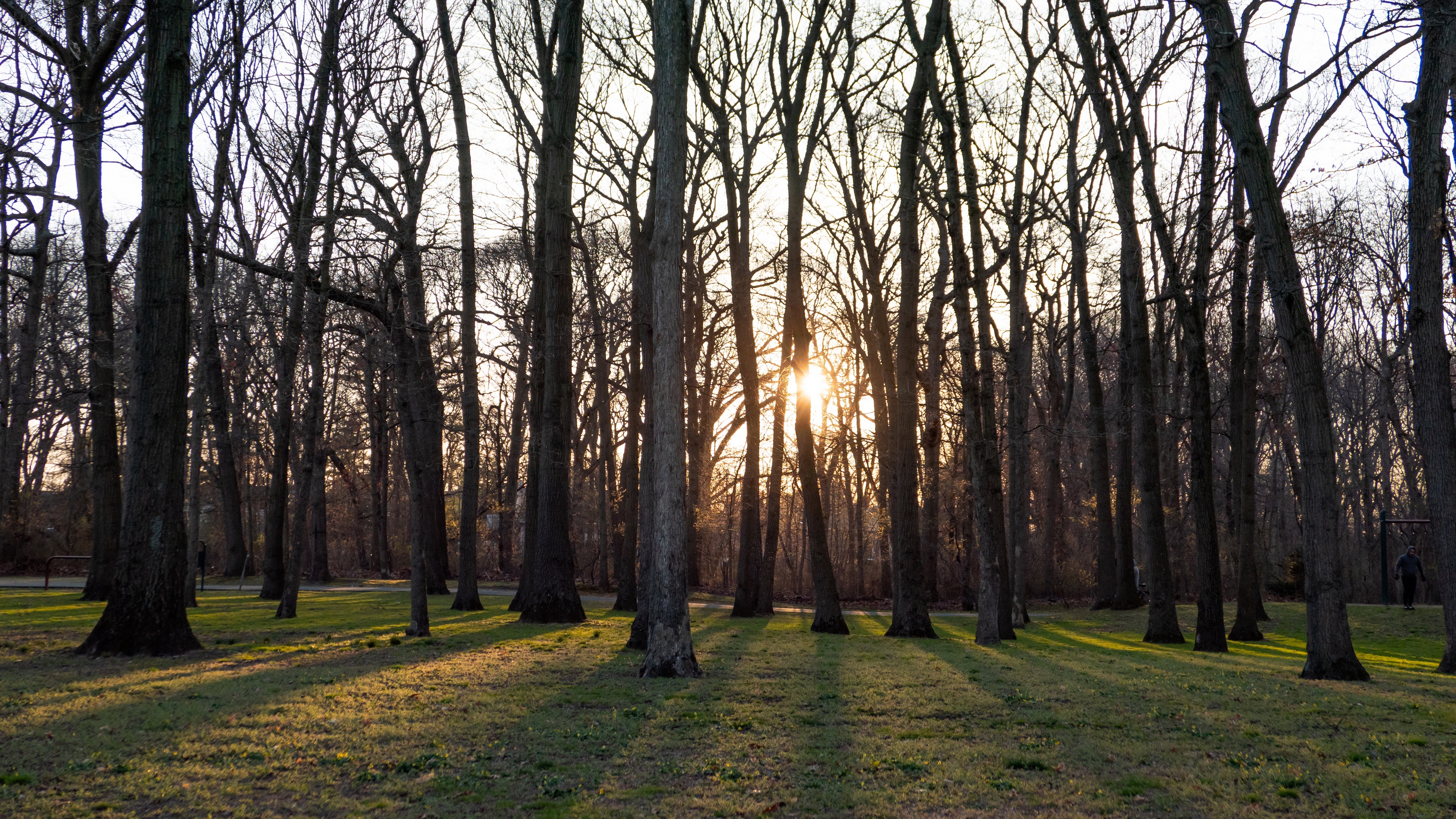 Description: A sun shines through the trees in a park area with grass and trees in the foreground and a person walking in the distance.