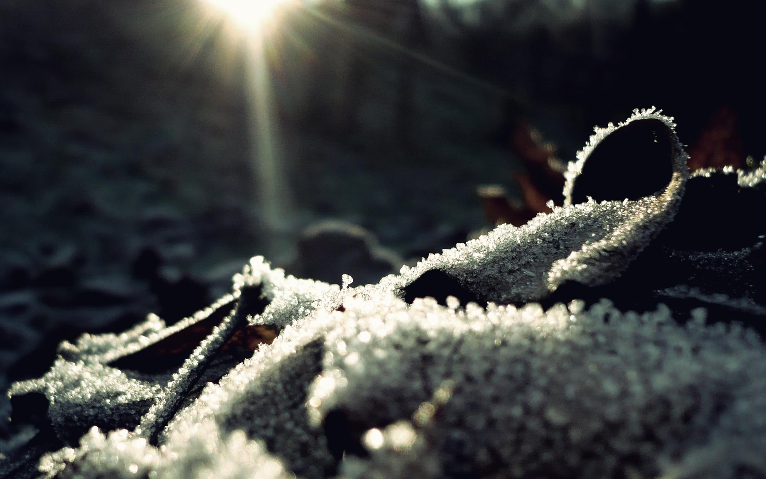 Description: A close up of a sun shining through the snow on a leafy plant stem and a sunbeam.