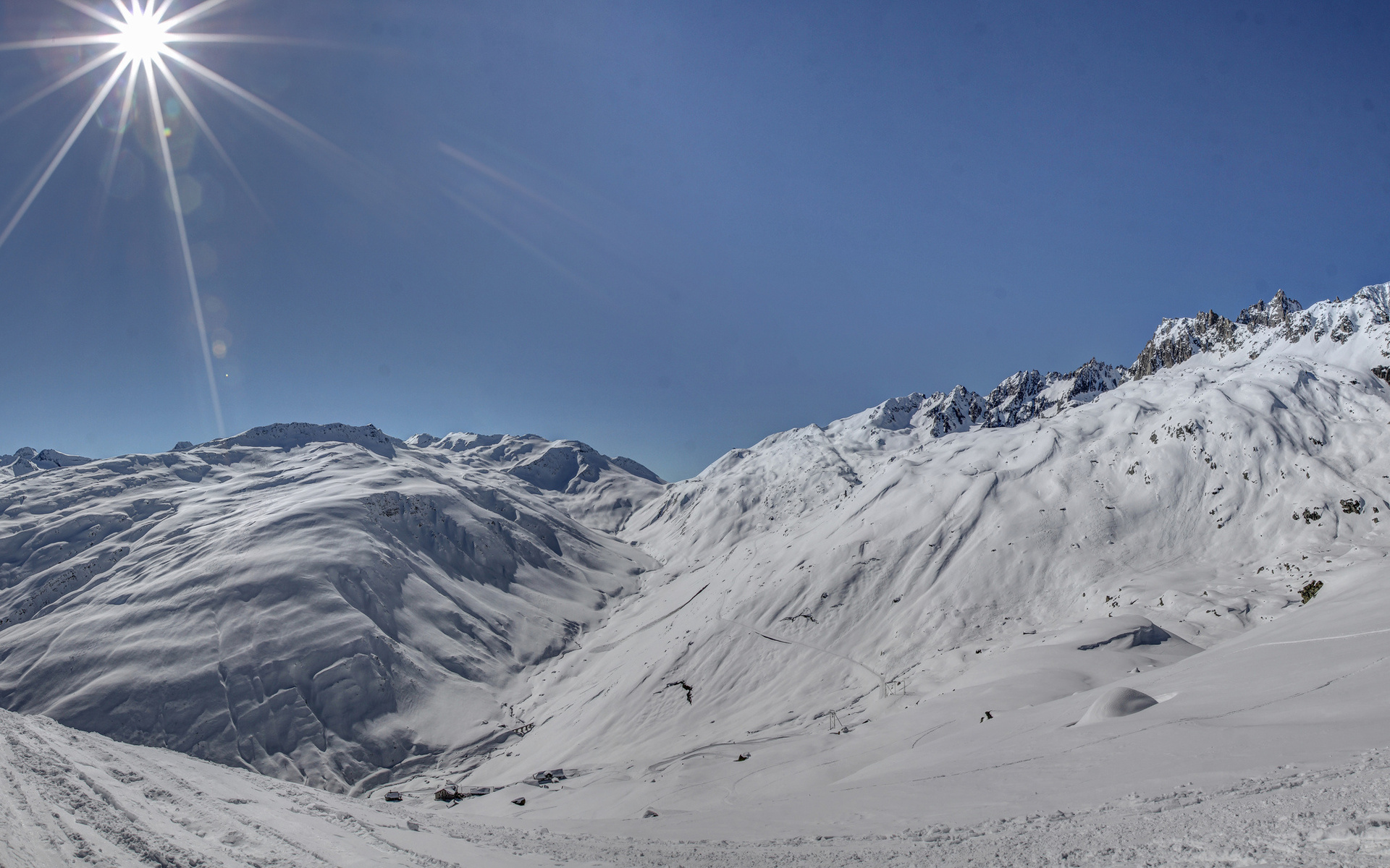 Description: A sun shines over a snowy mountain range with a clear blue sky above it and a bright sun shining over the mountain.