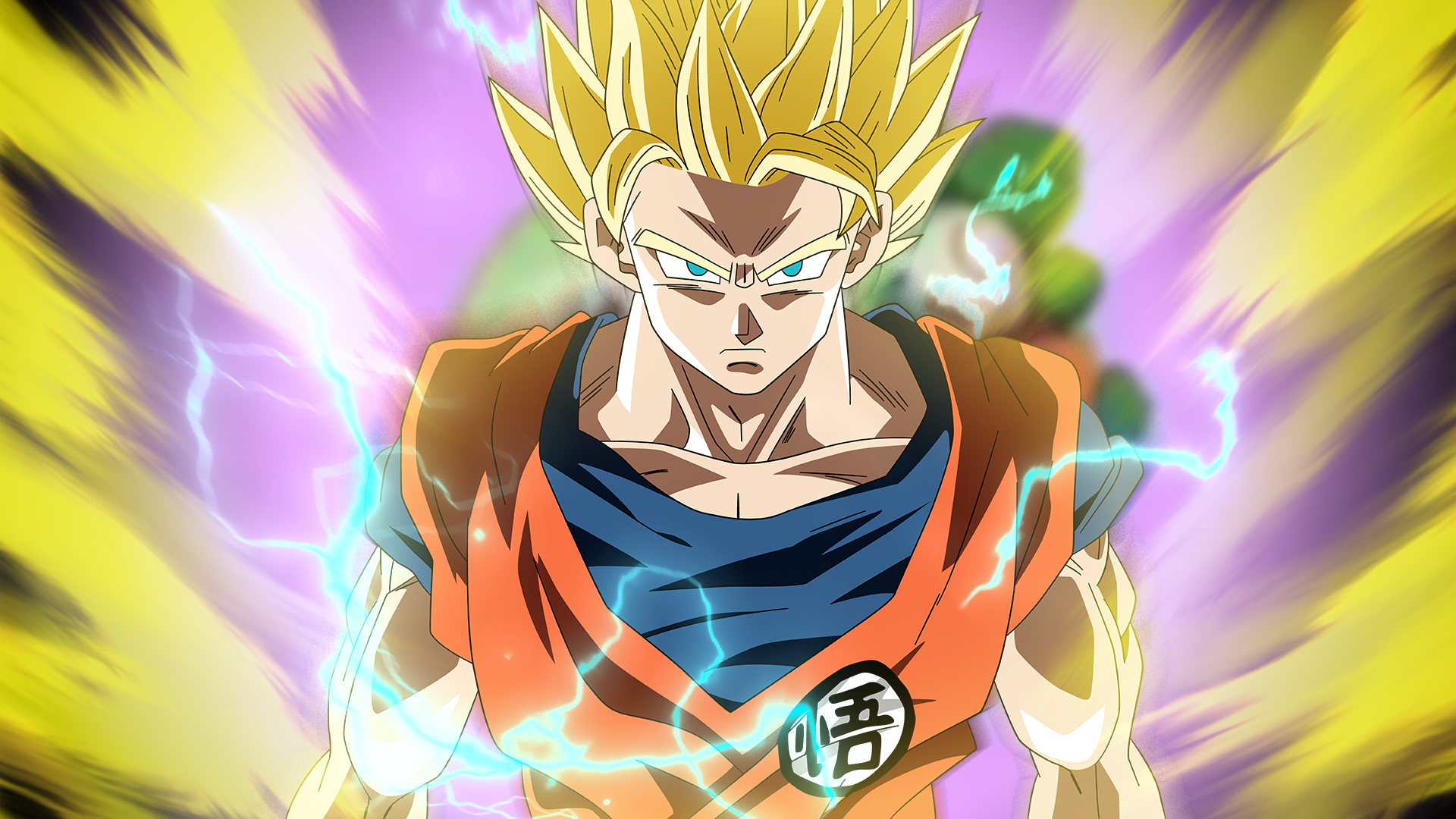 Description: A dragon ball fighter with a lightning background and a yellow and purple background with a black and white dragon.