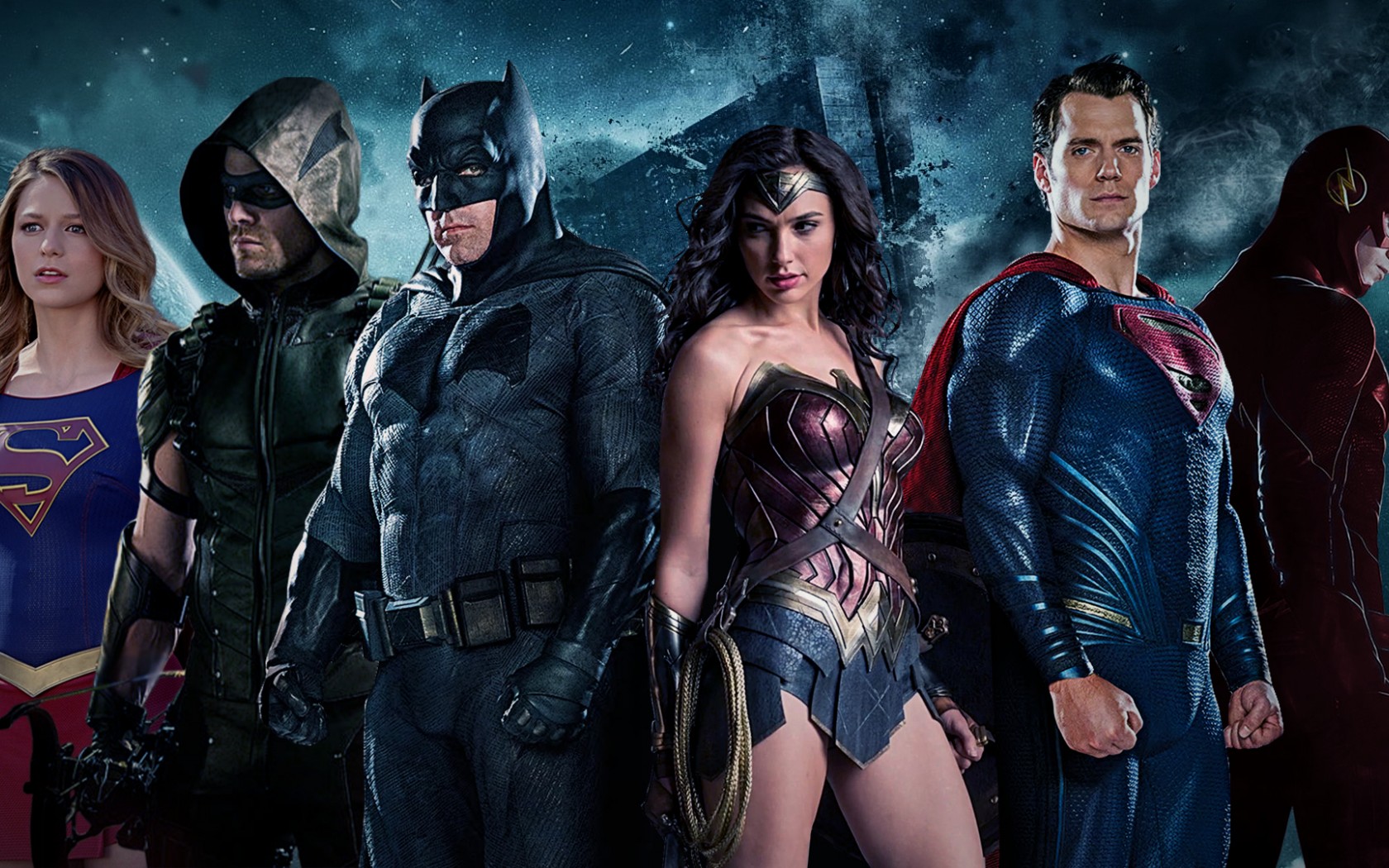 Description: A group of people dressed up as superheros and wonder twins in a movie poster for the dc tv series.
