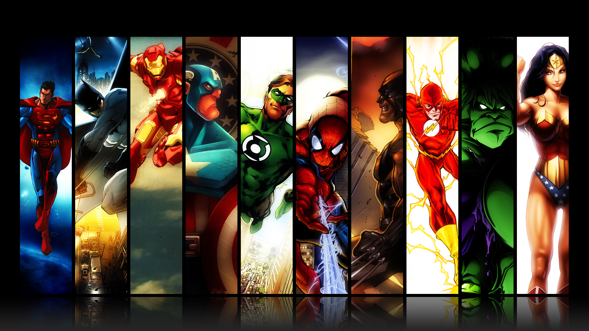 Description: A series of superheros and their characters in a collage of different colors and sizes.