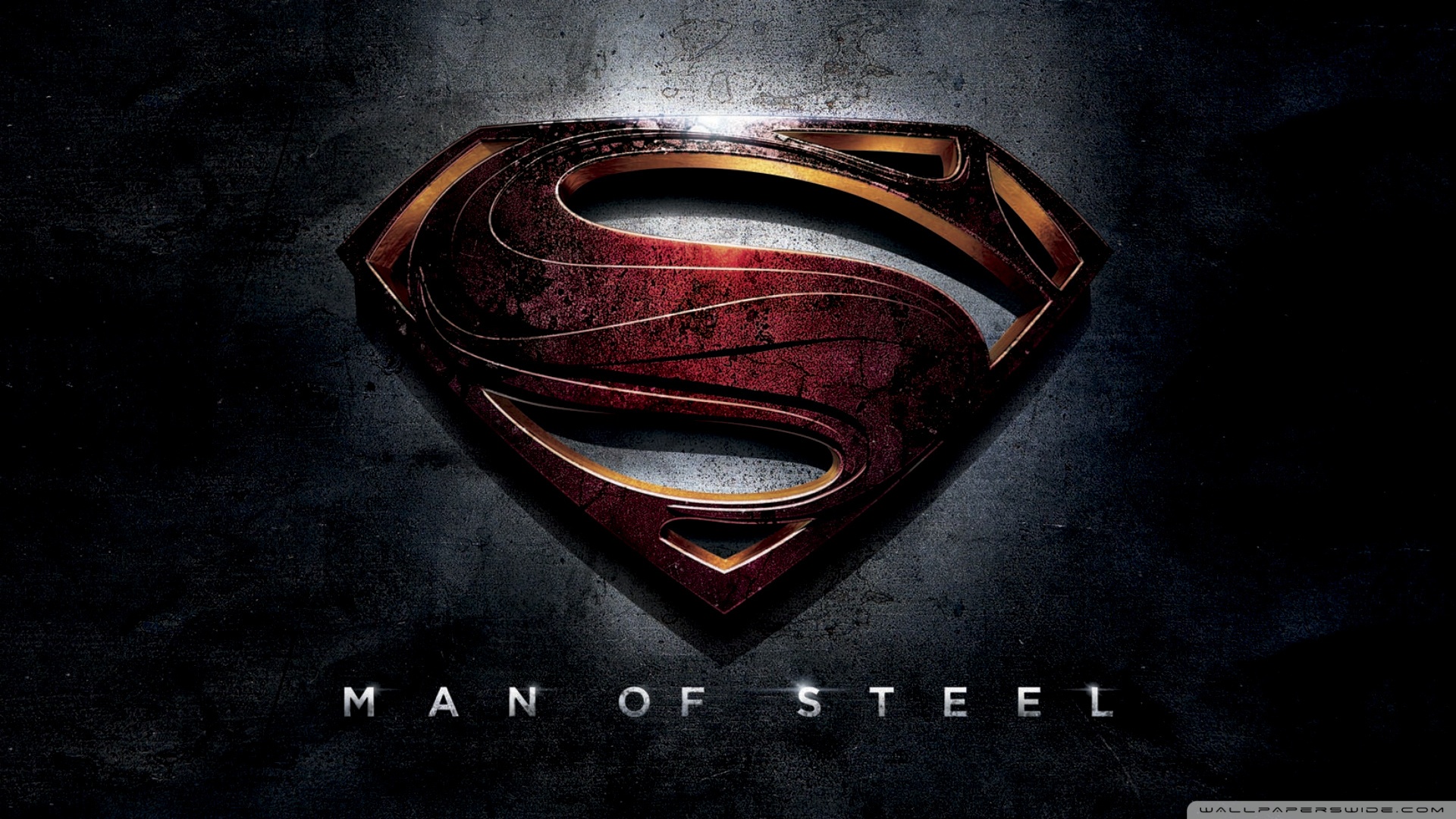 Description: A superman logo on a dark background with the words man of steel written below it in gold and red.