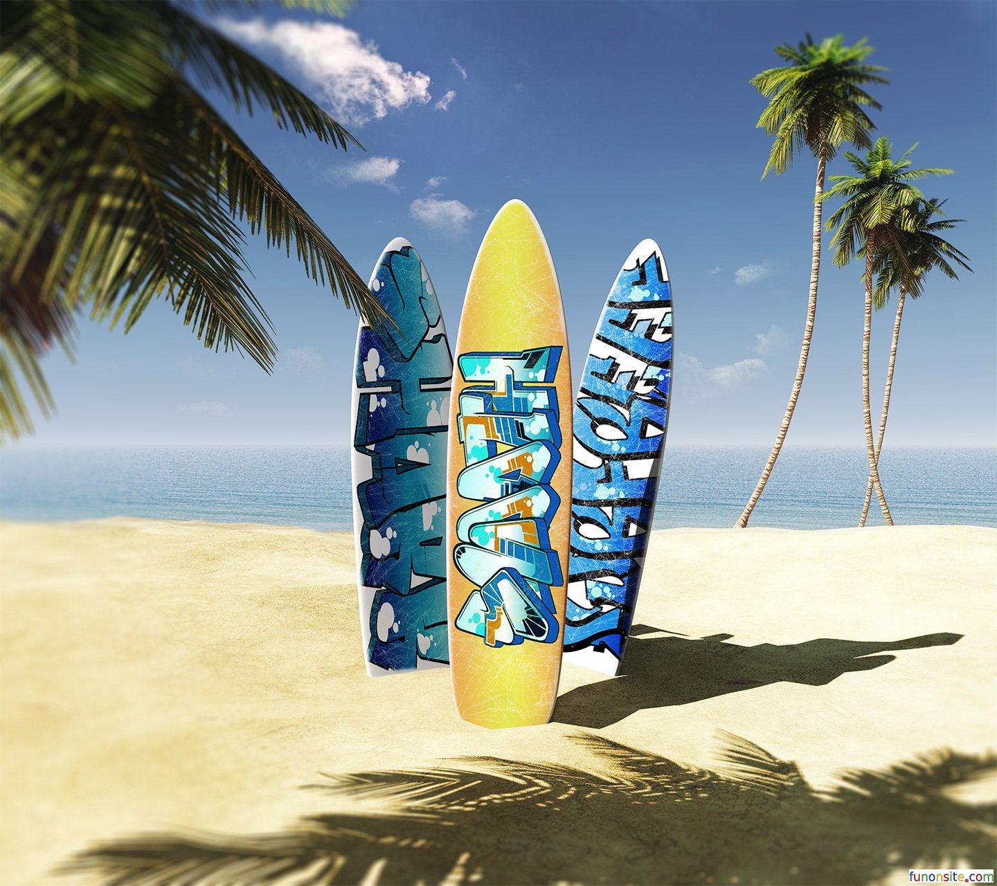 Description: A surfboard is standing on the sand near the ocean and palm trees.