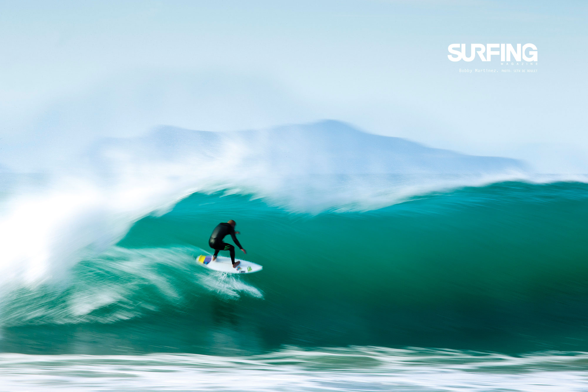 Description: A surfer riding a wave in the ocean on a surfboard with a mountain in the background and a sky background.