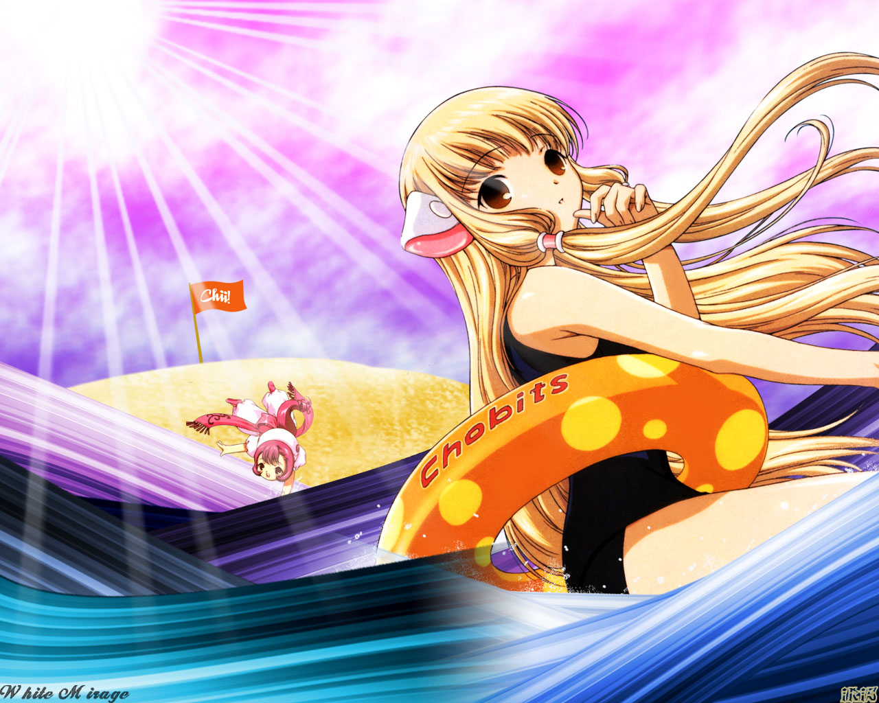 Description: A girl in a bikini riding a surfboard in the ocean with a flag on it's back.