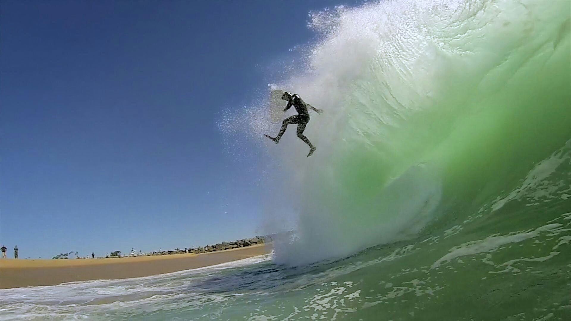 Description: A man riding a wave on top of a surfboard in the ocean on a sunny day with a blue sky.