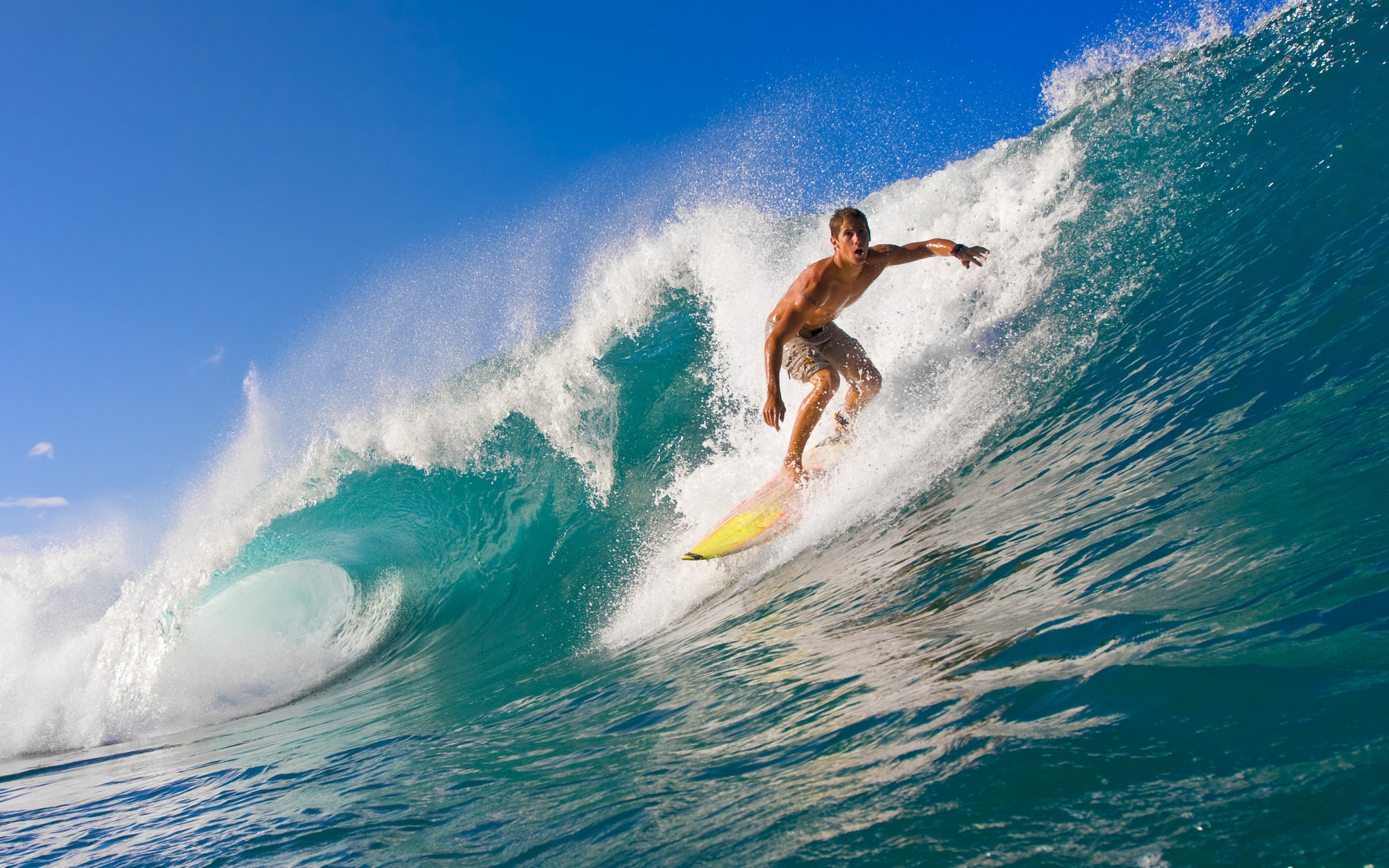 Description: A man riding a wave on top of a surfboard in the ocean on a sunny day with a blue sky.