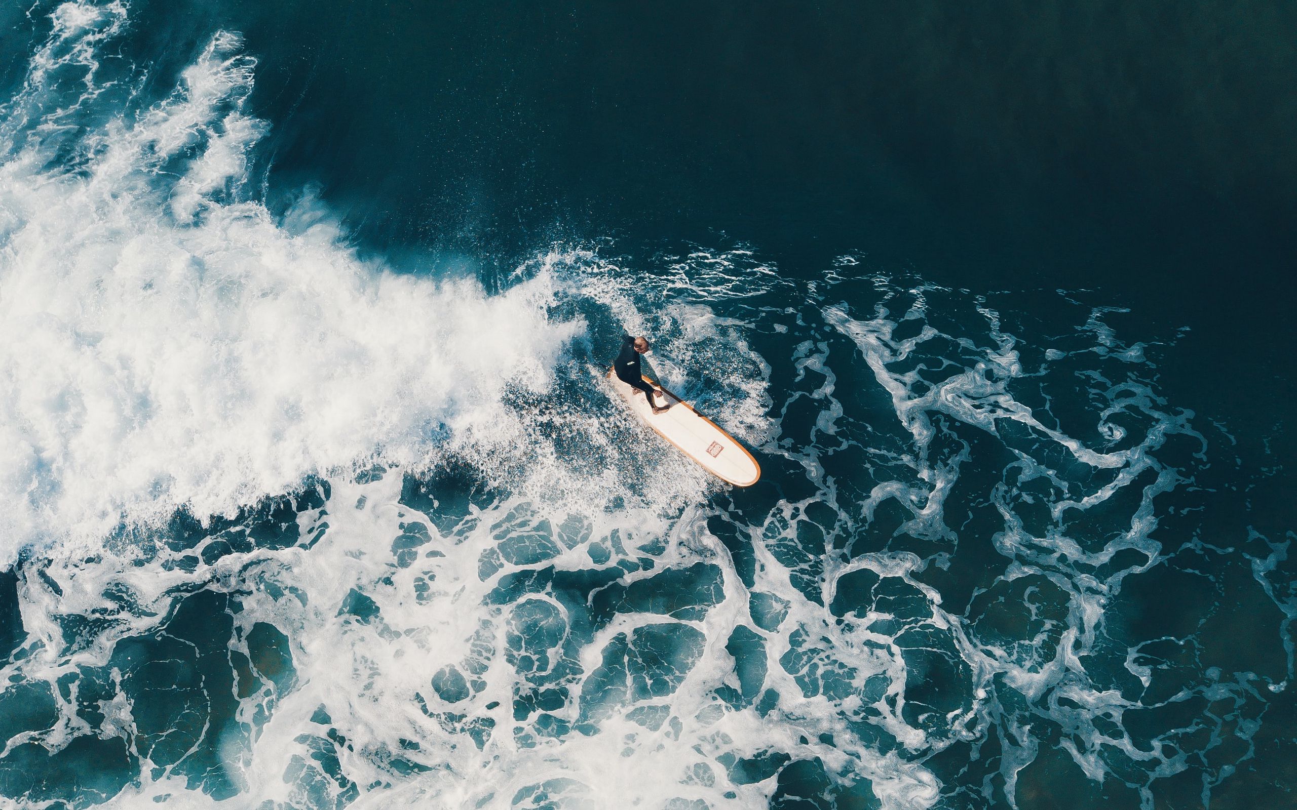 Description: A person riding a surfboard on a wave in the ocean with a surfboard in the water behind them.