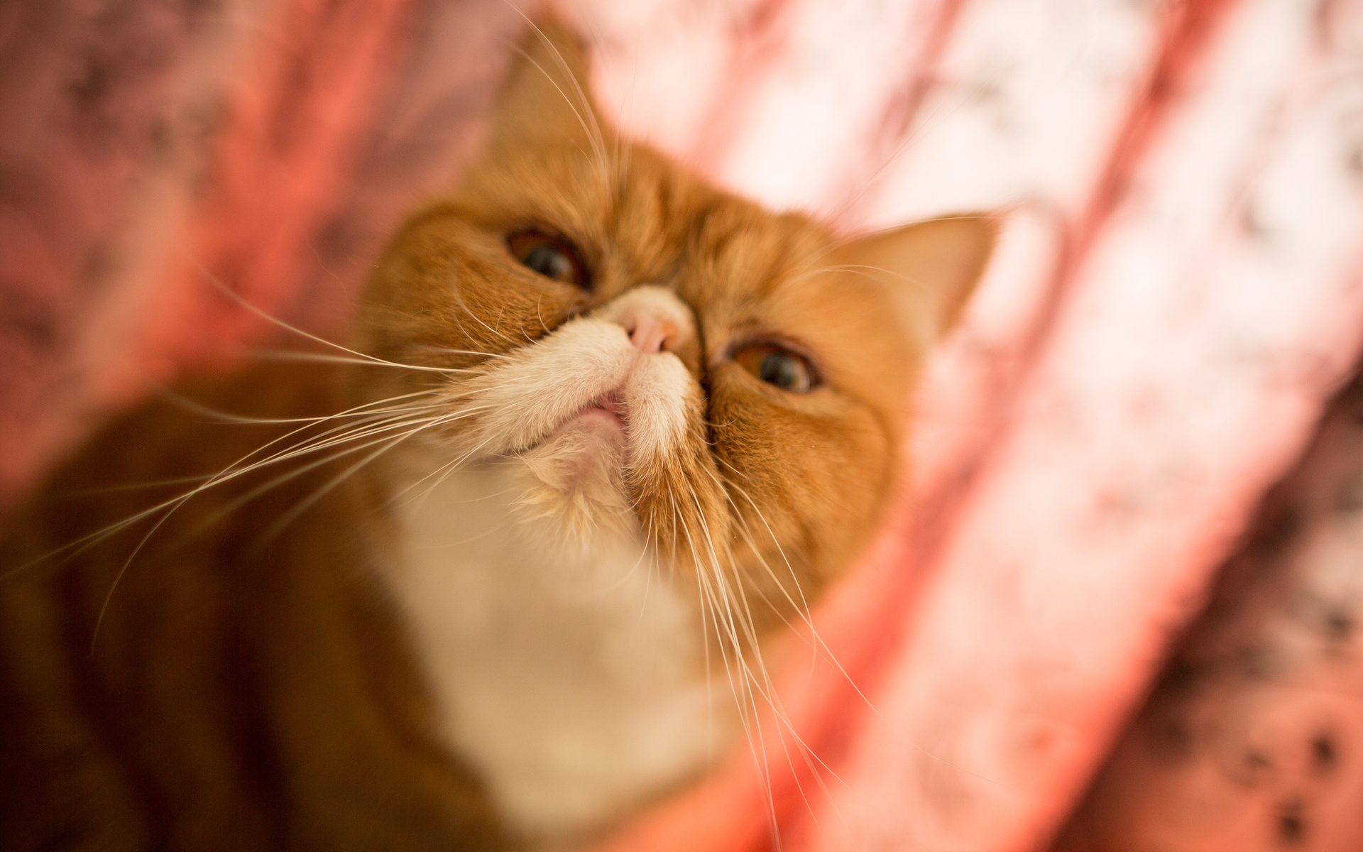 Description: A cat is looking up at the camera with a surprised look on its face and nose.