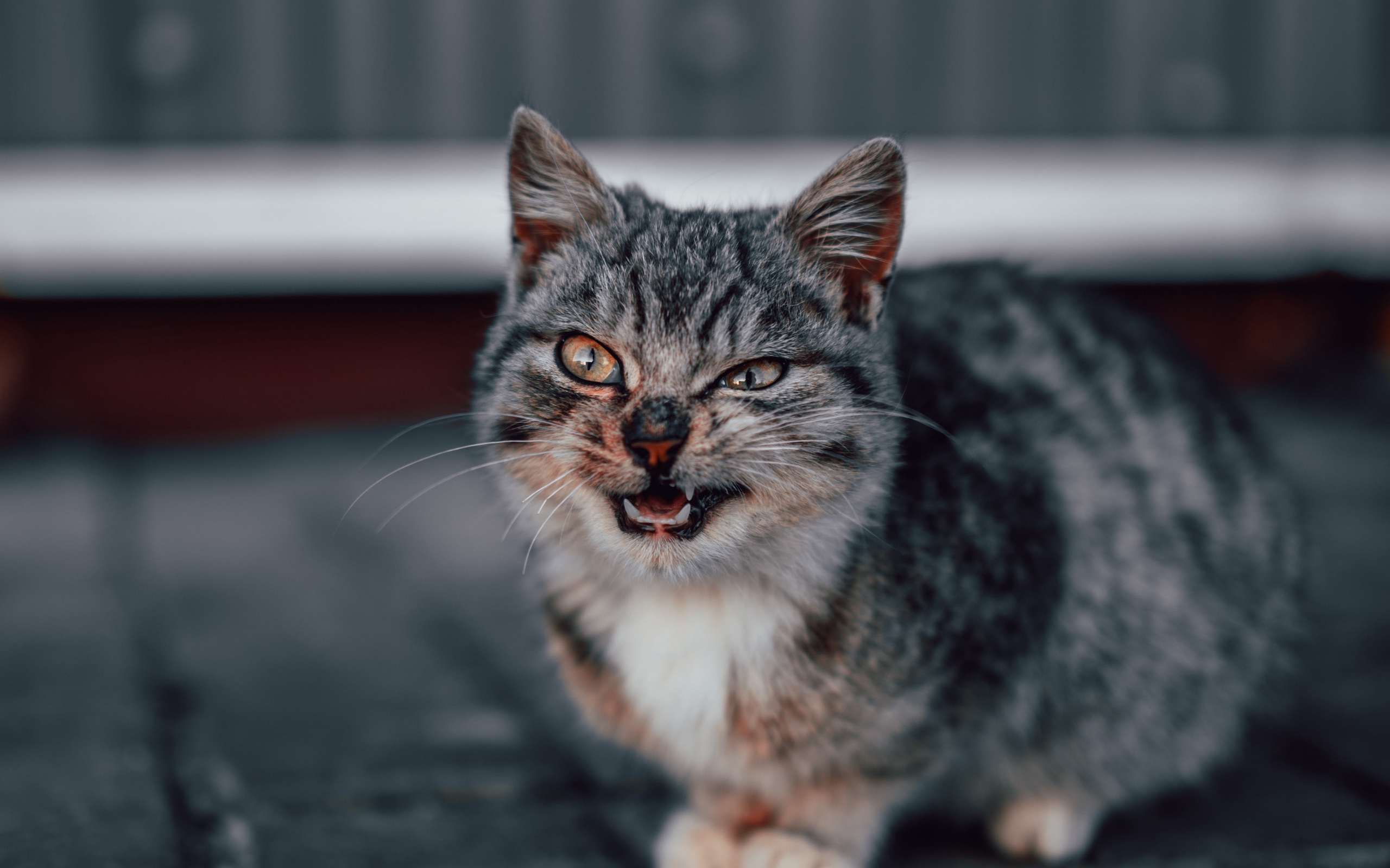 Description: A cat with a surprised look on its face sitting on the ground with its mouth open and eyes wide open.