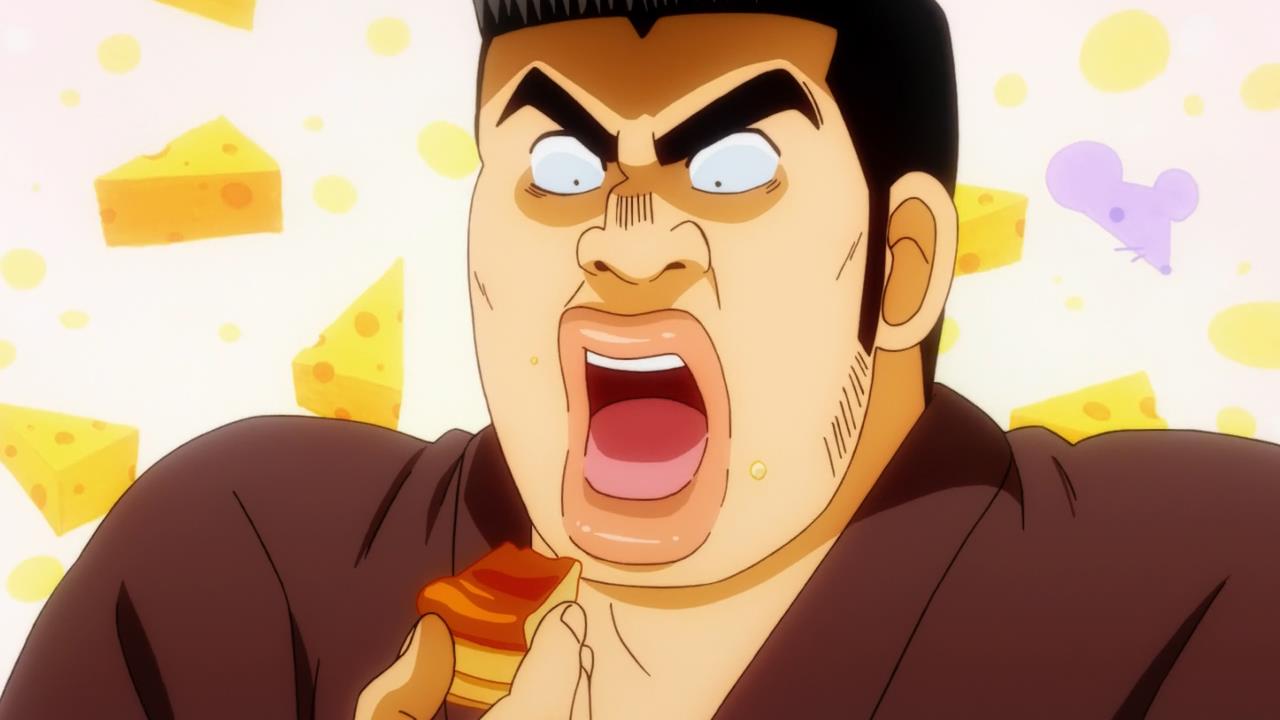 Description: A man with a surprised look holding a piece of food in his hand and looking at the camera with a surprised look on his face.