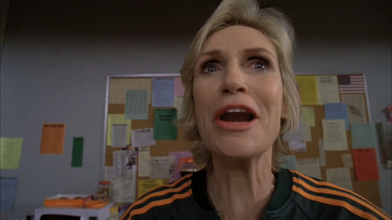 Description: A woman with a surprised look on her face in a room with post it notes on the wall and a microwave.