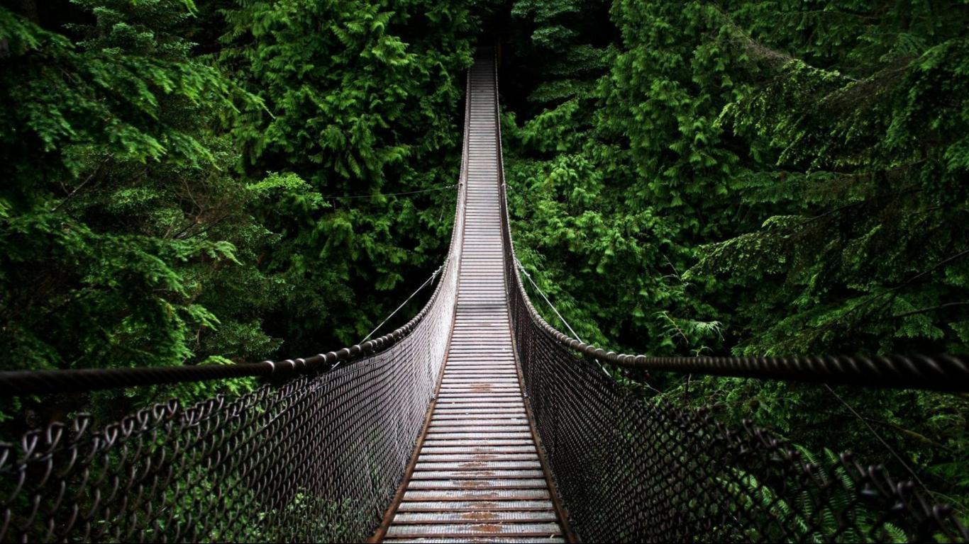 Description: A suspension bridge in the middle of a forest with trees on both sides of it and a walkway leading up to the top.