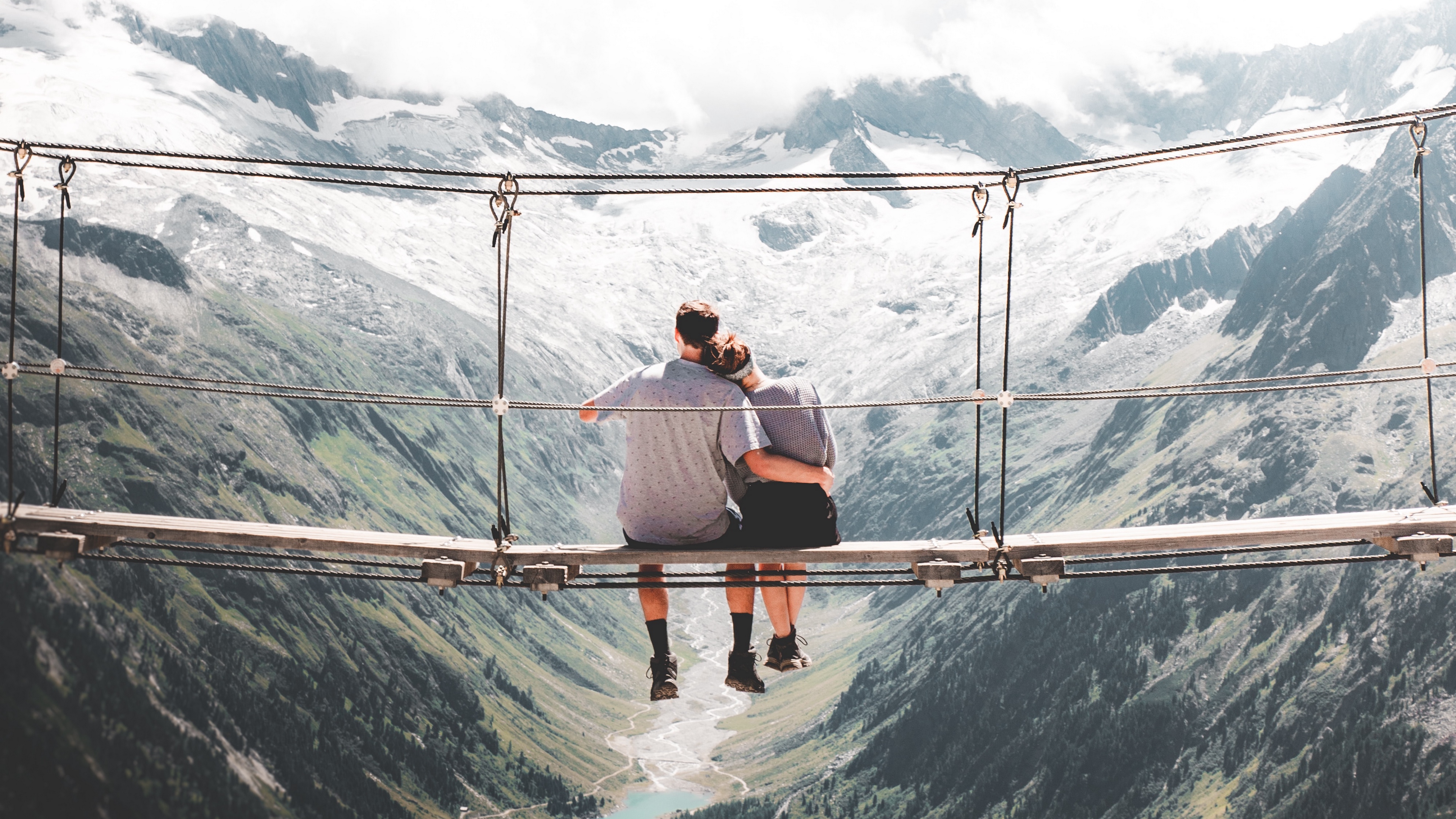 Description: A man sitting on a suspension bridge looking at the mountains below him and holding his head in his hands.
