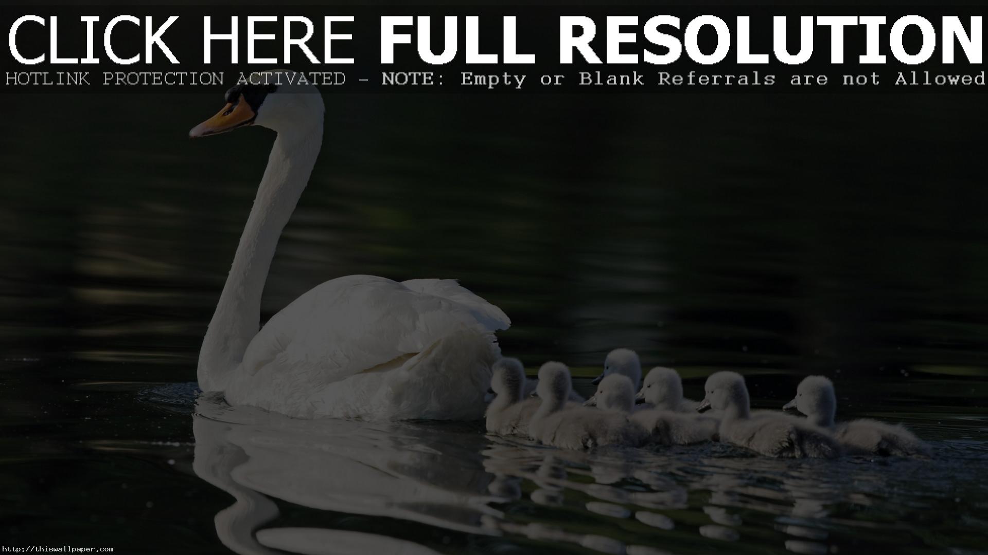 Description: A swan with its babies swimming in the water with a caption that reads click here full resolution.