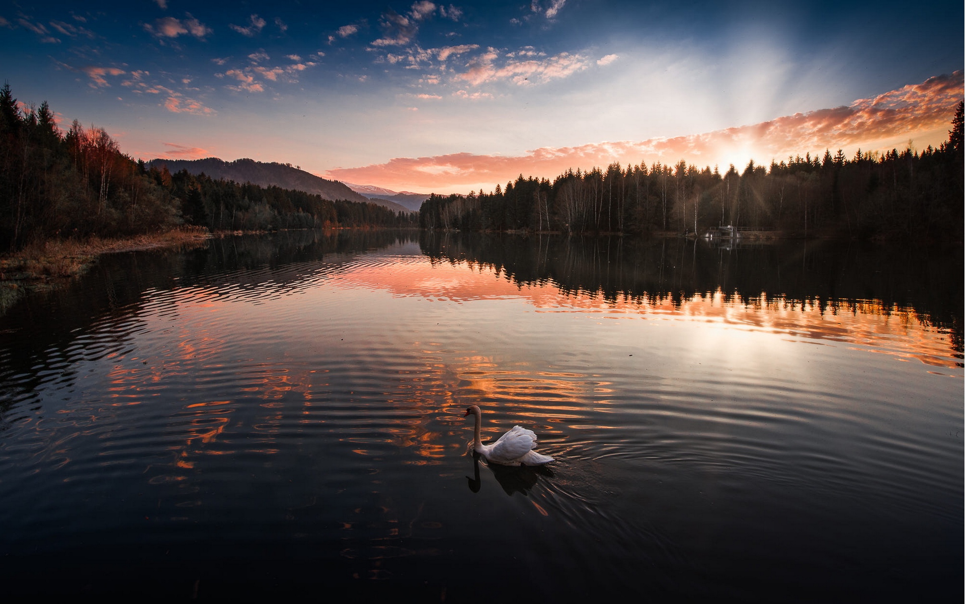 Description: A swan is swimming in a lake at sunset with a beautiful sky above it and trees in the background.
