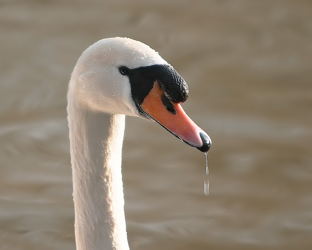 Description: A swan with a long neck and a black head is standing in the water and has a drop of water in its beak.