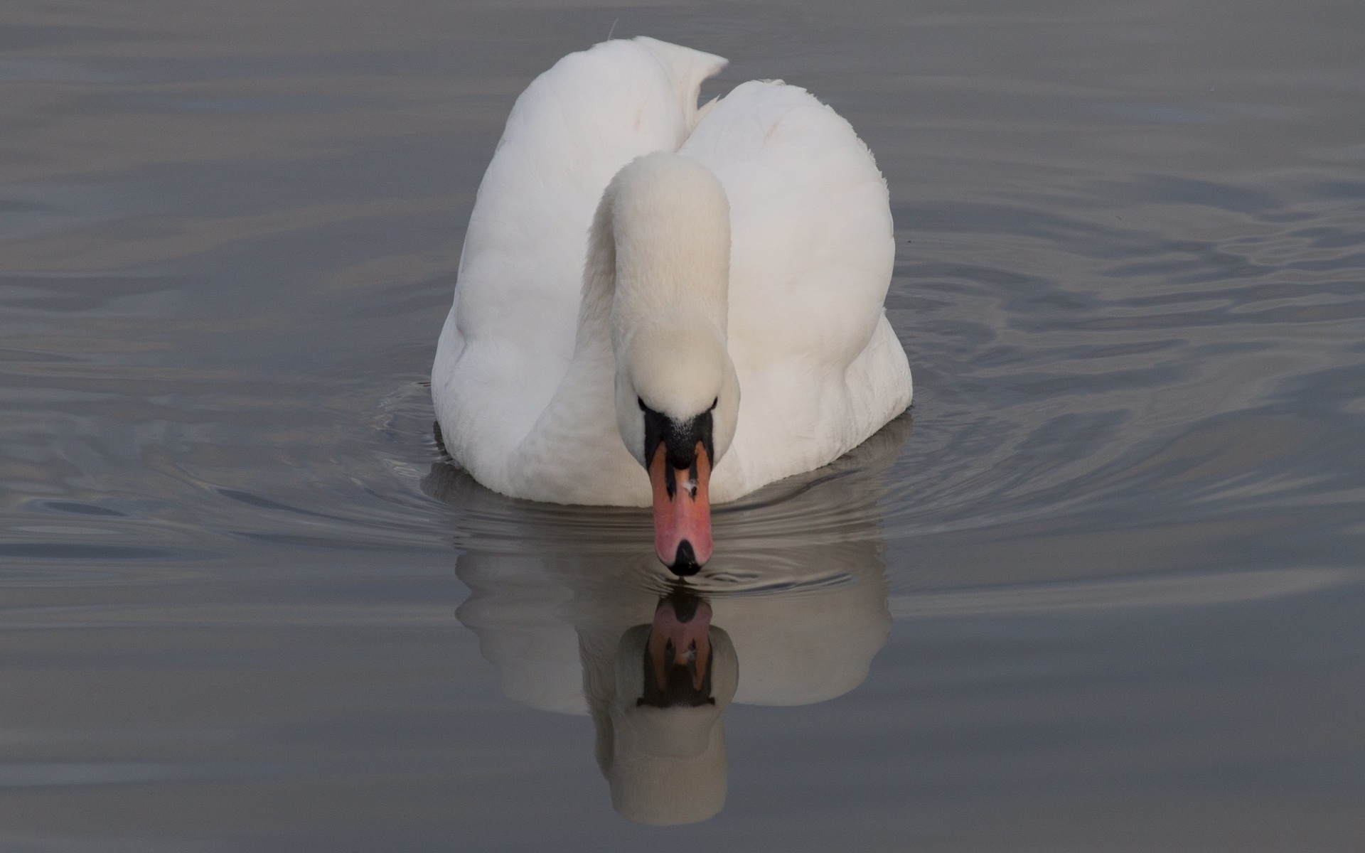 Description: A swan is swimming in the water with its head in the water and its reflection in the water is visible.
