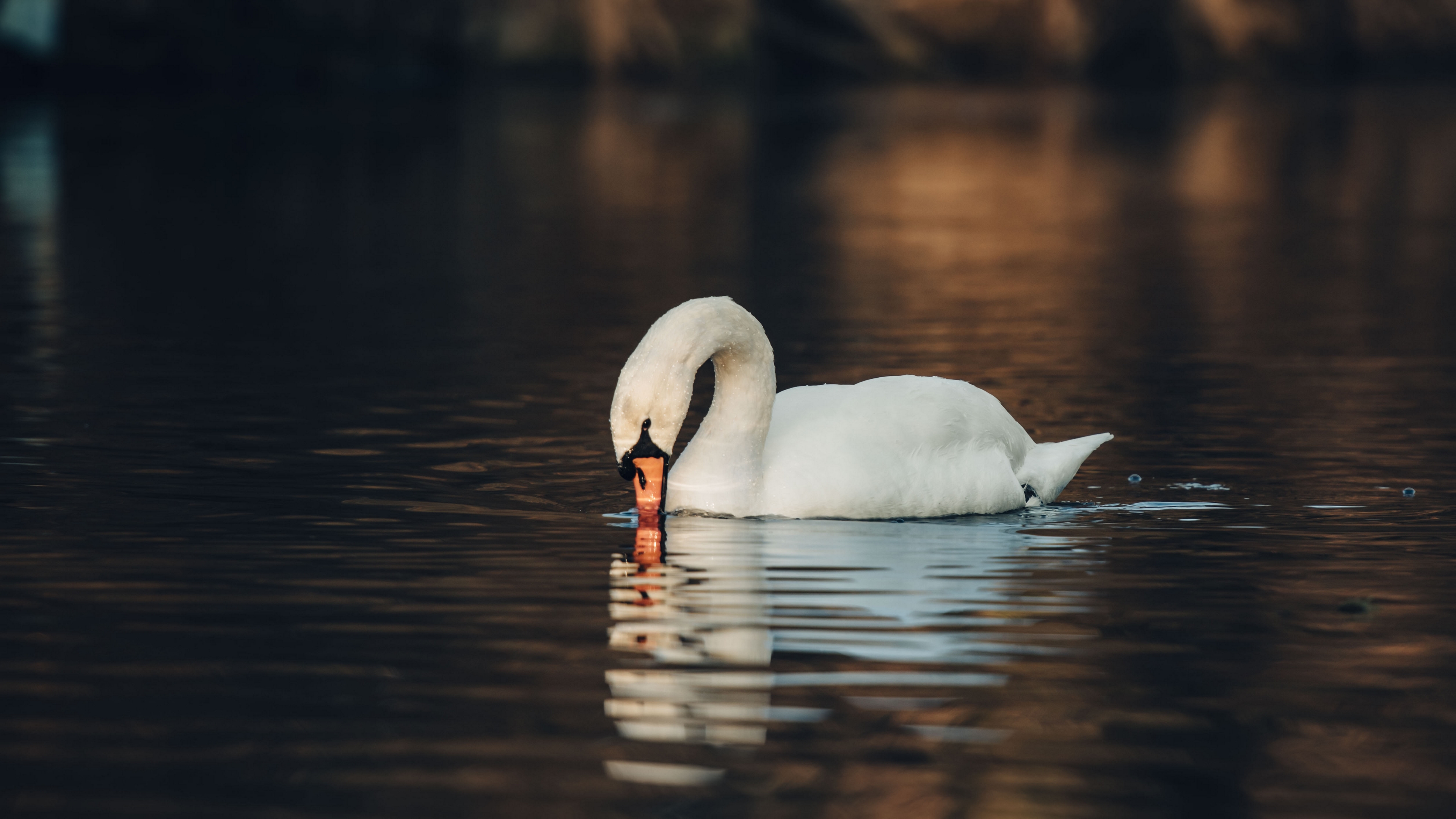 Description: A swan is swimming in the water with its head in the water and its beak in the water.