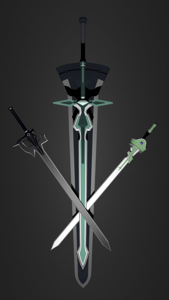 Description: A sword and two swords are hanging from a hook on a wall in a dark room with a black background.