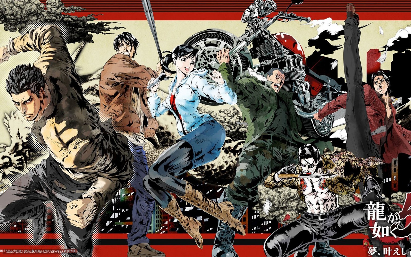 Description: A group of people with swords and a demon on a red background with a black and white background and a red stripe.