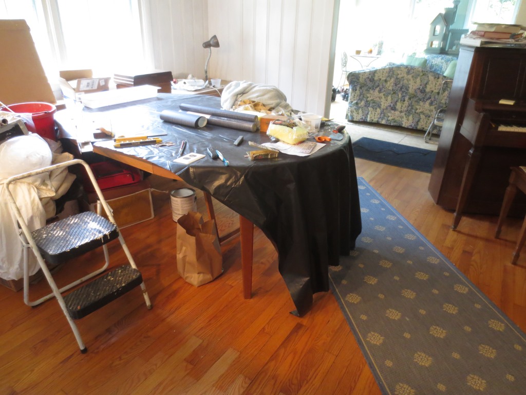 Description: A table with a black table cloth on it in a room with a chair and a couch in it.