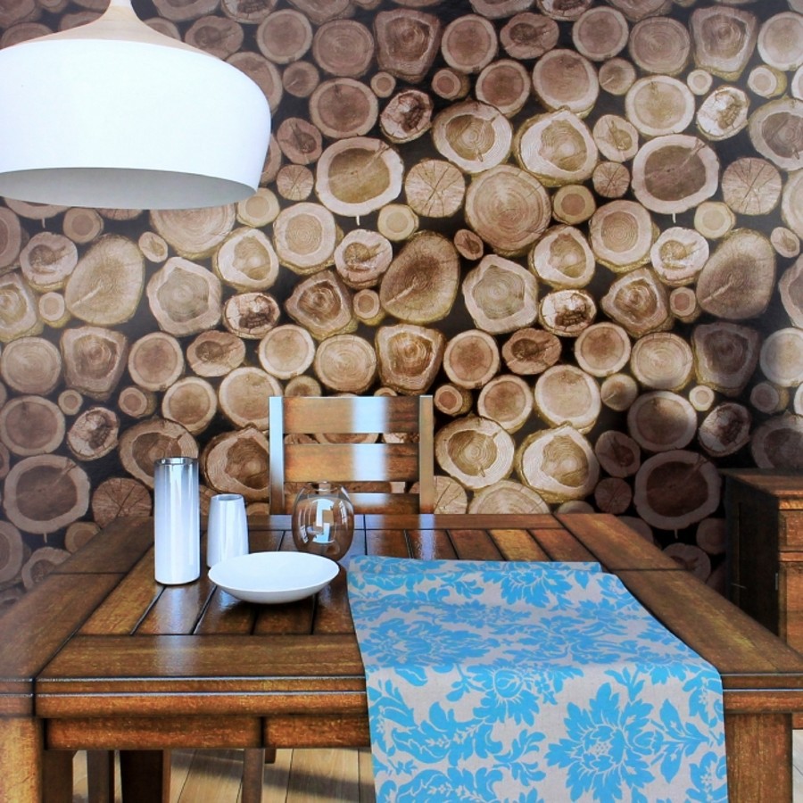 Description: A table with a blue and white table cloth and a lamp on it and a wooden table with a blue and white table cloth.