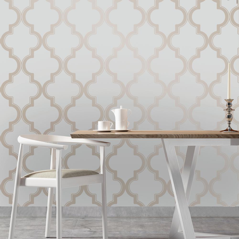 Description: A table with a candle and a vase on it in front of a wallpapered wall with a geometric pattern.