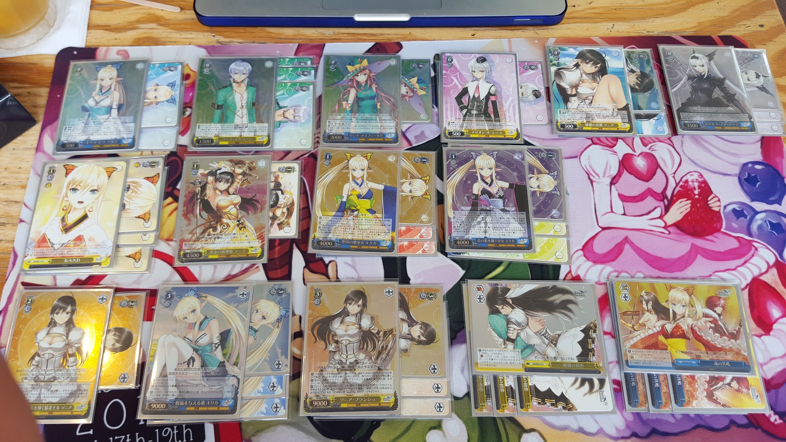 Description: A table topped with lots of cards and a laptop computer on top of it next to a table covered with cards.