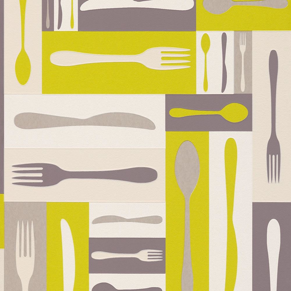 Description: A picture of a table with a lot of forks and spoons on it and a yellow and gray background.